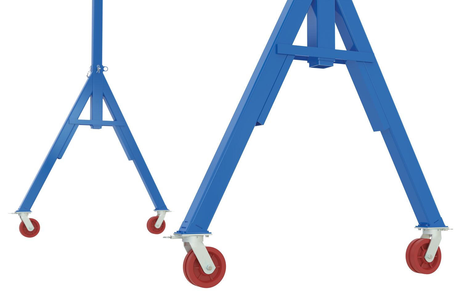 The fixed height steel gantry crane is designed for transporting and positioning materials along the beams length. The solid steel construction will provide years of service, while the painted blue finish will keep the models protected from surface ware. Unit comes standard four (4) V-groove casters, allowing for quick movement and positioning adjustments. The unit is an economical and efficient way to lift and raise products, diminishing the need of additional personnel. The fixed height design allows for constant use in a particular setting without the need to maneuver the overall height of the unit.