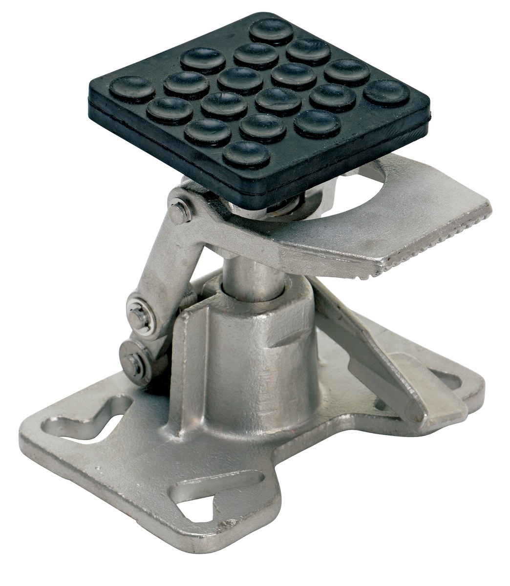Stainless Steel Adjustable Floor Lock 6-1/4 to 8 In. Height SilverThis one of a kind adjustable height Floor Lock includes an adjustable height foot pad that will work on carts with different caster heights. The adjustable height feature provides uniform locking and safety unlocking force for better ergonomic operation. This feature also keeps the floor lock working properly as spring and pads wear over time. Height is adjustable by turning the bottom pad. The bottom pad includes suction-cups for extra grip.