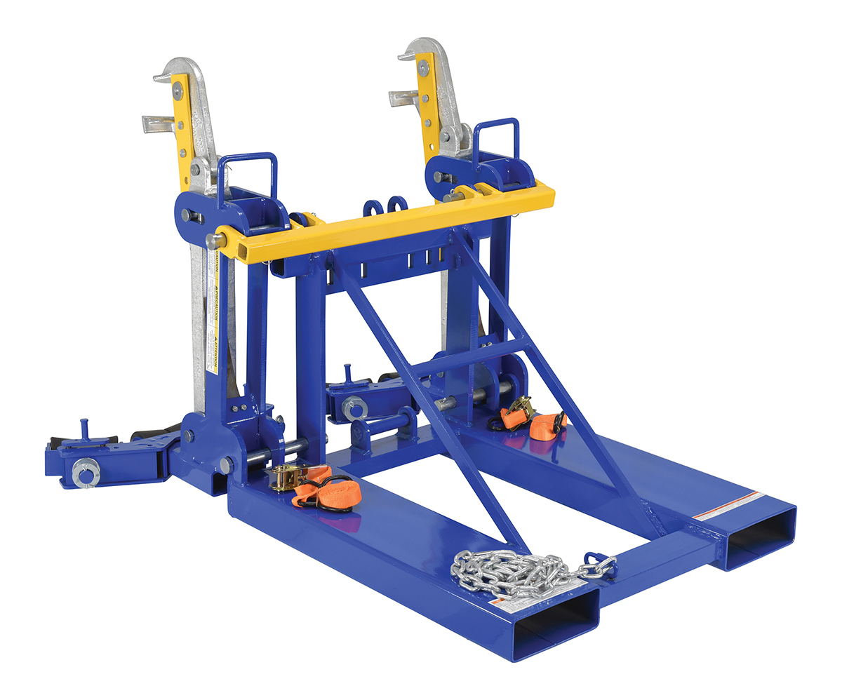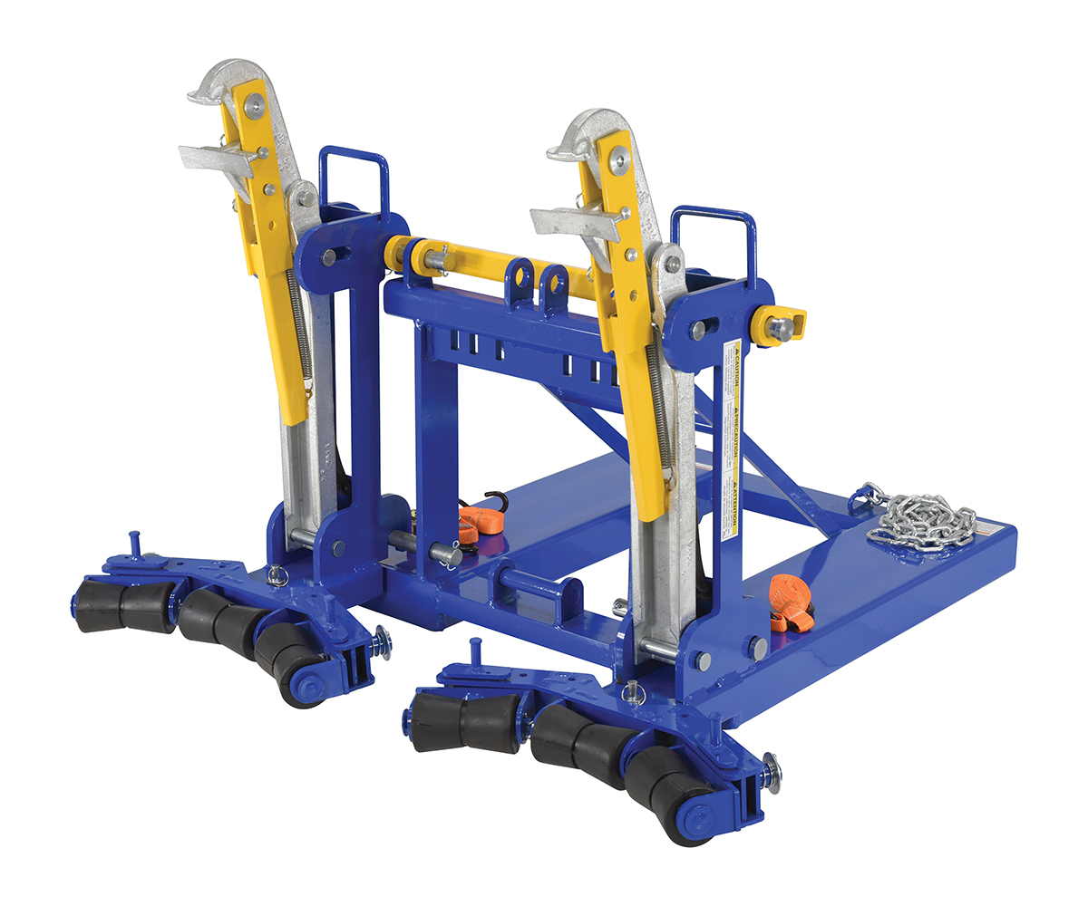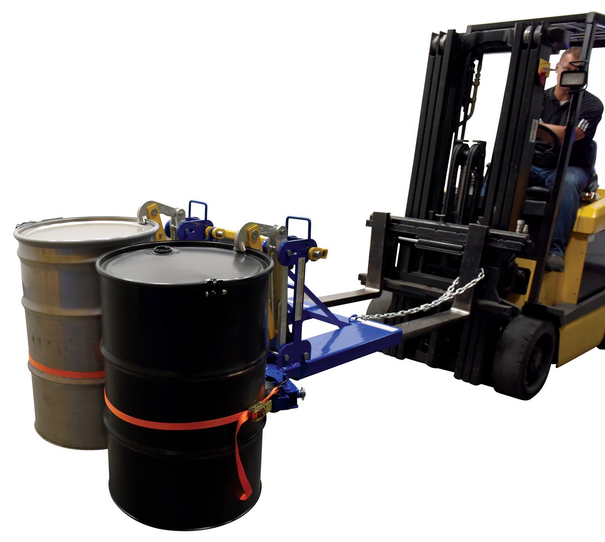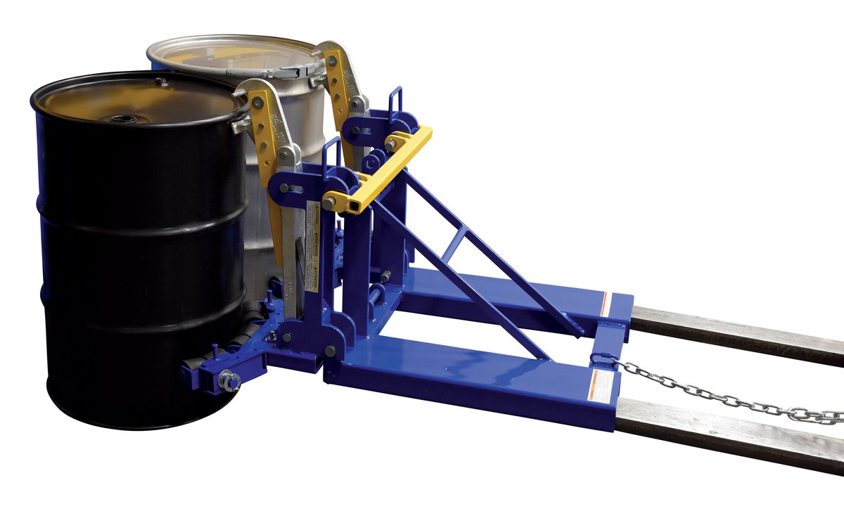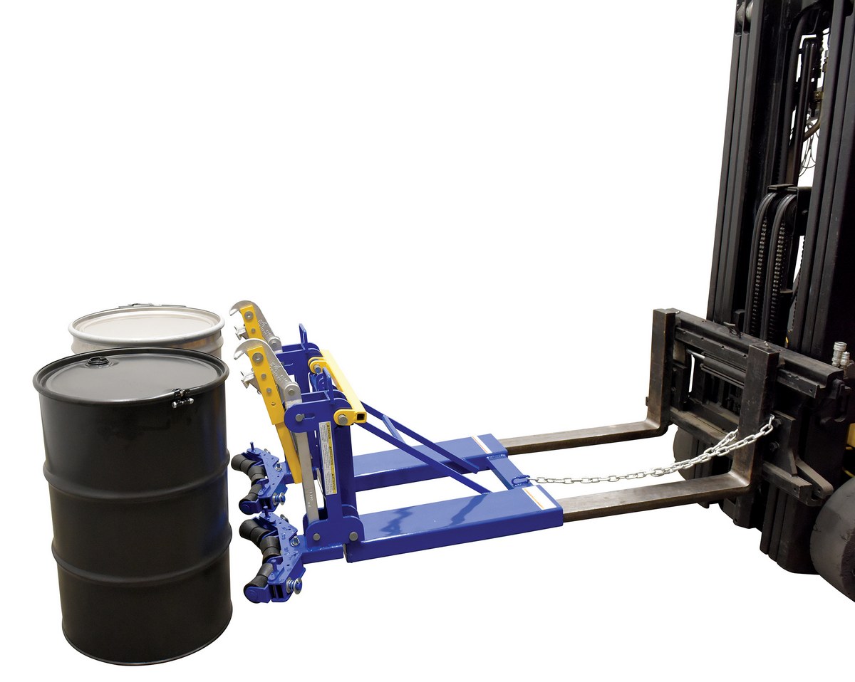 This time tested and proven design allows a fork truck operator to easily secure, move, and release drums without leaving the seat of the fork truck. For use with open (lid installed and secured) and closed head steel, plastic, and fiber drums with a top lip strong enough to support the weight of the drum. Includes safety restraint to secure unit to the fork truck. Welded steel construction. Baked-in powder-coated toughness. A ratchet strap is supplied to secure the drum to the unit when traveling over rough terrain.