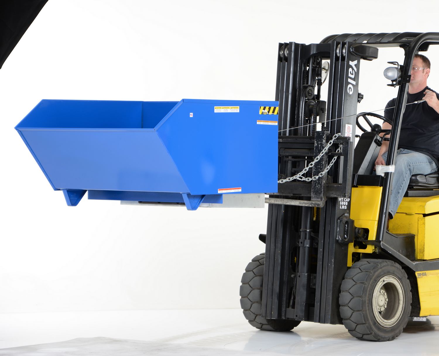 Steel Medium Duty Low Profile Self Dumping Hopper 1 Cubic Yard 4000 Lb. Capacity BlueThe Medium Duty Low Profile 90 degree self-dumping steel Hopper feature a full ninety (90) degree dump angle with a cushioned rubber bumper stop. The low profile design is essential for convenient loading. Dumping with a fork truck is quick and simple. A cable is pulled from the seat of the fork truck to dump the hopper. The unit returns to an upright and locked position when lowered to the ground. Fork pockets are 22" long and are capped on the end to allow for 90 degrees dump. The included safety restraint/chain must be securely attached to the lift truck carriage without slack. Models with same overall width may be stacked. For example, models H-25 may be stacked with H-50’s, the H-100’s can be stacked with H-150’s, while the H-200 hoppers can only be stacked with other H-200 series models. Never stack hoppers more than 3 high.