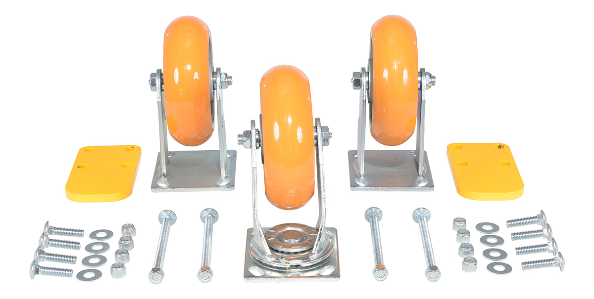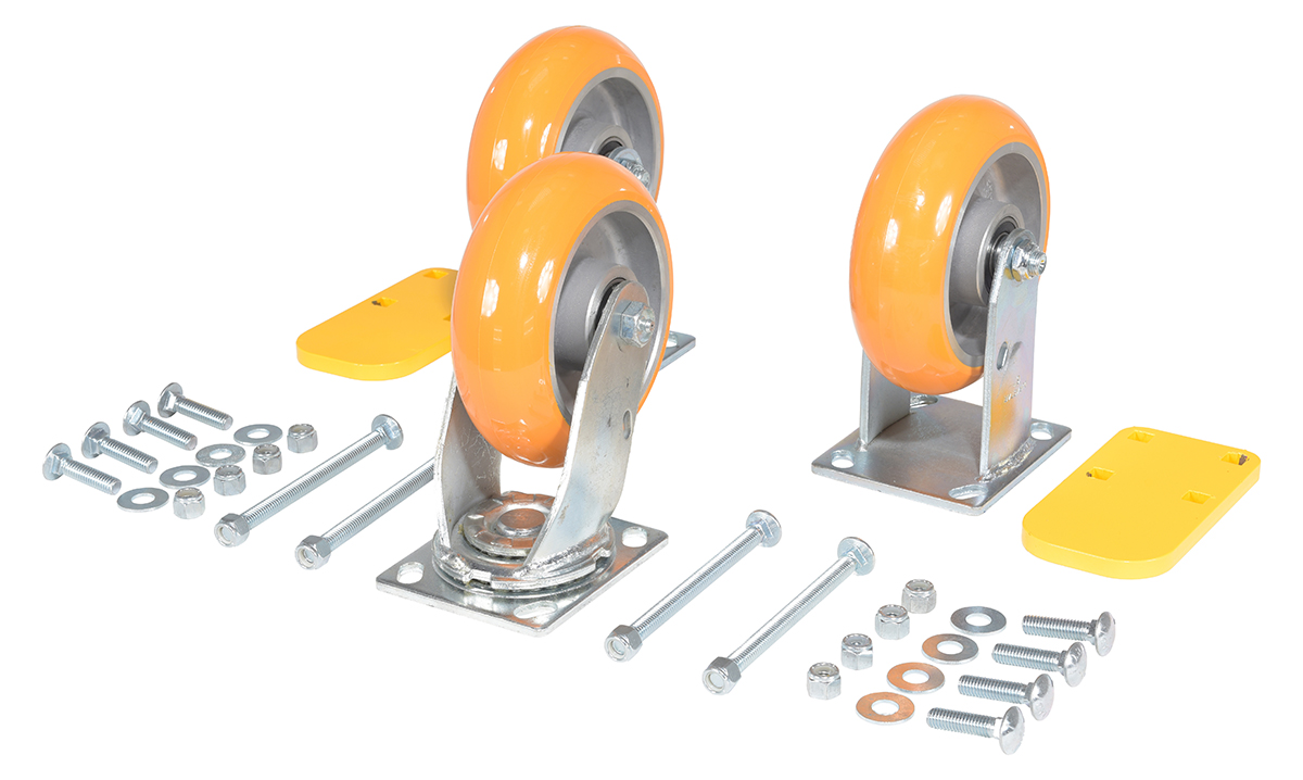 Elastic Polyurethane Caster Kit 6 In. x 2 In. 8,000 Lb. Capacity ButterscotchConstructed of high-grade elastic Polyurethane and coupled with 6203 premium precision ball bearings for added strength and durability. The upgraded tread provides a longer life, reduces the force required for movement and offers exceptional floor preservation. Orange tread color. 85 Shore A. wheel core is constructed of high-grade, light-weight, water resistant aluminum. Made In Taiwan.