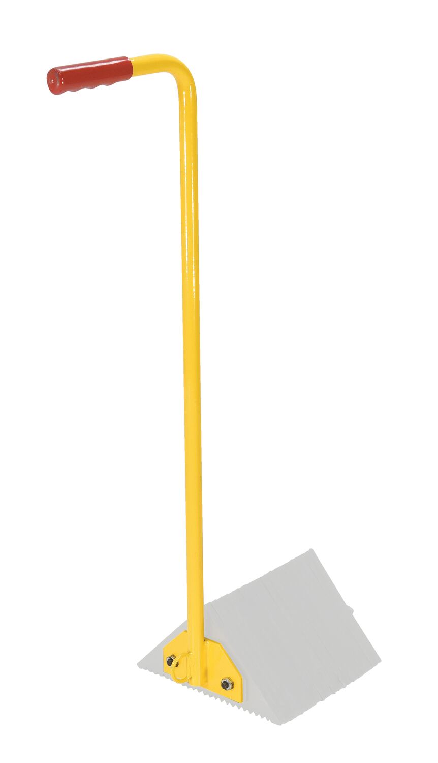 Steel Ergonomic Wheel Chock Handle YellowThis optional Wheel Chock ergo handle provides an ergonomic style handle that prevents bending to pull wheel chock from tire. D-ring provided for attaching security chain (chain not included).