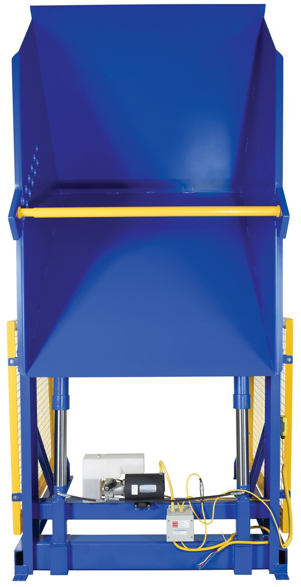Steel Electric Hydraulic Box Dumper 48 In. Dump Height 4,000 Lb. Capacity BlueThe electric/Hydraulic box dumper is designed for controlled dumping of material from boxes, crates, and other types of containers. It is designed for pallet truck loading and unloading. The retaining bar adjusts to accommodate a wide range of container heights. Each dump height has a hold down range and an internal power unit with a hand held control standard. It has a heavy-duty welded steel construction with protective mesh side screens included.