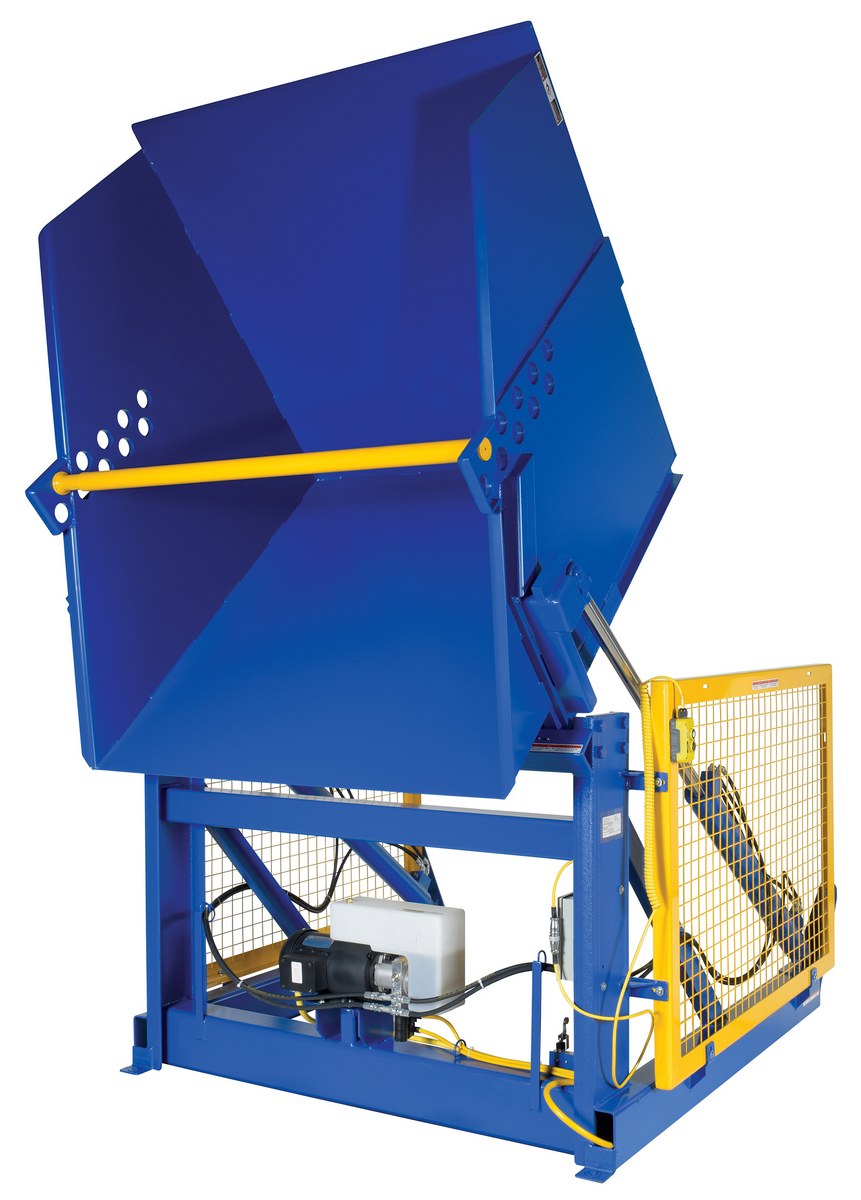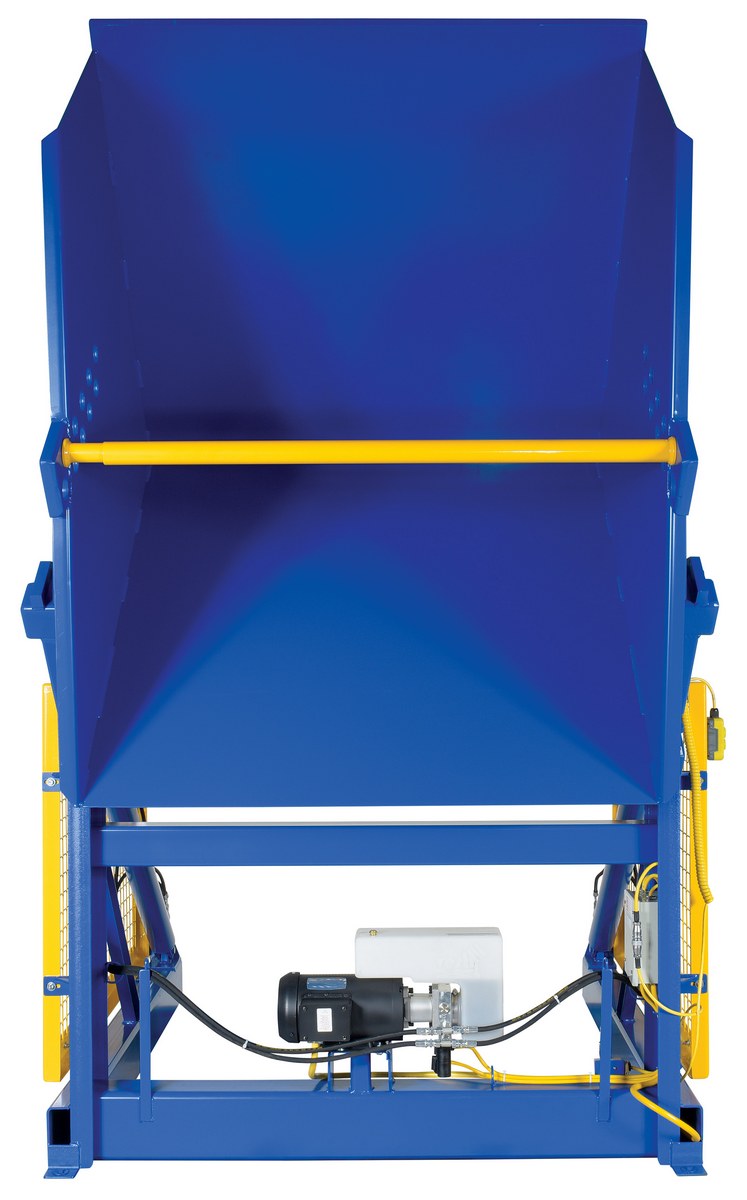 Steel Electric Hydraulic Box Dumper 36 In. Dump Height 6,000 Lb. Capacity BlueThe electric/Hydraulic box dumper is designed for controlled dumping of material from boxes, crates, and other types of containers. It is designed for pallet truck loading and unloading. The retaining bar adjusts to accommodate a wide range of container heights. Each dump height has a hold down range and an internal power unit with a hand held control standard. It has a heavy-duty welded steel construction with protective mesh side screens included.