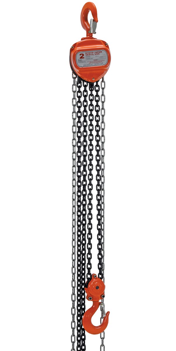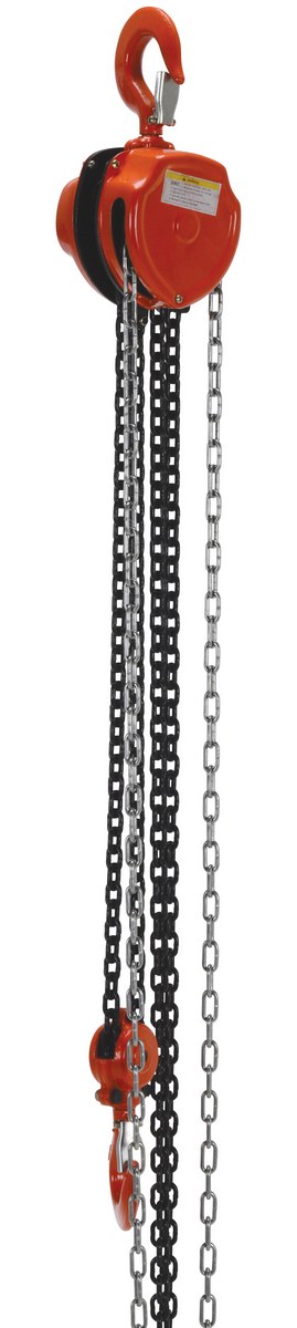 Steel Manual Chain Hoist 10 Ft. Lift 4,000 Lb. Capacity OrangeThis portable, lightweight hand Chain Hoist is durable and easy to operate. Compact design and low headroom allow installation in confined areas. Enclosed double ratchet pawls with self adjusting disc brake standard. Designed with a safety factory four (4) times rated capacity. Individually tested at 150% rated capacity. Features black chain tempered to ISO 3077, pull chain, hardened two-stage gears and forged steel upper and lower hooks with safety latches. Constructed of high quality steel components ideal for industrial applications.