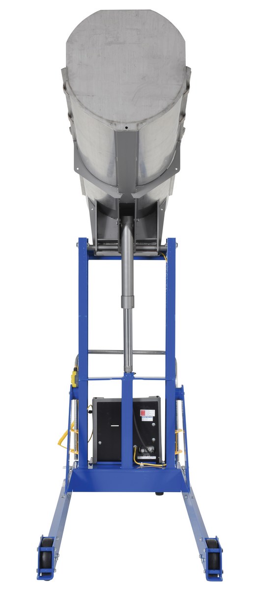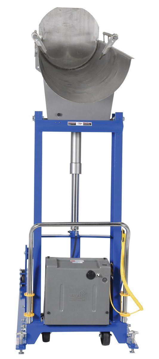 Stainless Steel Portable Hydraulic Drum Dumper 60 In. Dump Height 750 Lb. Capacity Blue/SilverThe Hydraulic drum dumper is what you need to dump heavy drums. Works with plastic, steel, and fiber drums. Dumper has a solid steel chute. This portable unit has casters with floor lock screws. All steel construction. Upper travel limit switch, emergency brass safety velocity fuse in cylinder, and vertical adjustment drum restraints are standard. Dumper is operated with a hand held control on a coil cord standard.