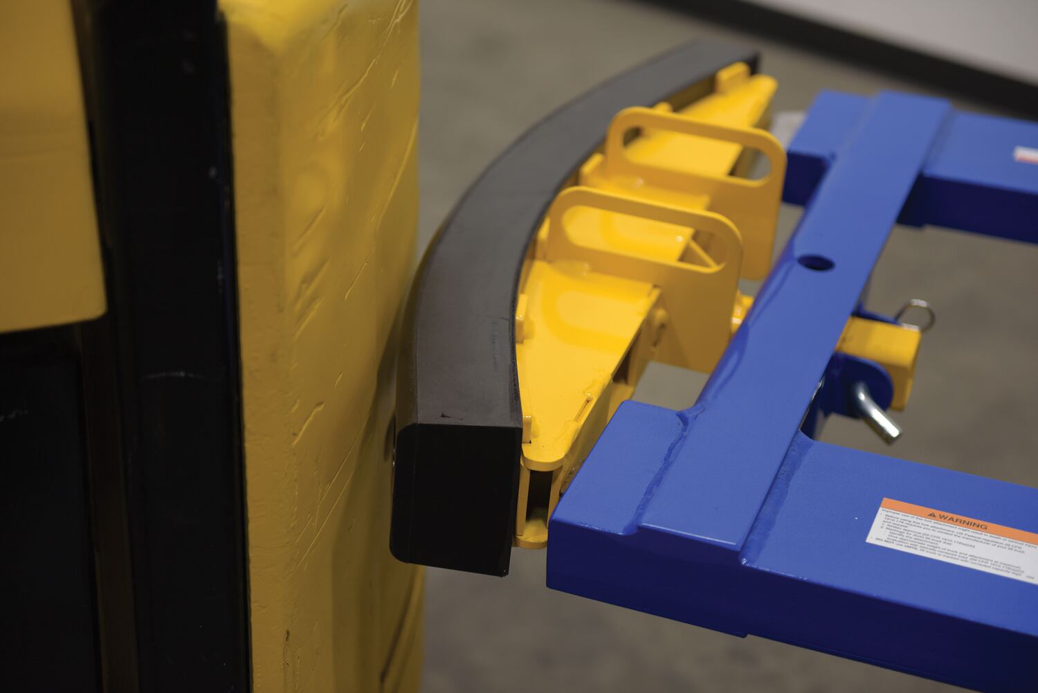 Steel Fork Truck Hook Base 32 In. Length With Steel/Rubber Push Bumper-Attachment to 2 In. Receiver 15 In. x 28 In. x 5-3/4 In Blue/YellowThis push bumper with a hook base is a nice addition to any industrial setting. With a quick and seamless attachment, the unit is able to be used immediately. The base is constructed of steel to keep up well with the wear and tear of daily use. The front push bumper, made of rubber, helps to minimize any damage and abrasion that may occur. Steel portion of unit is powder coated for built in added toughness.