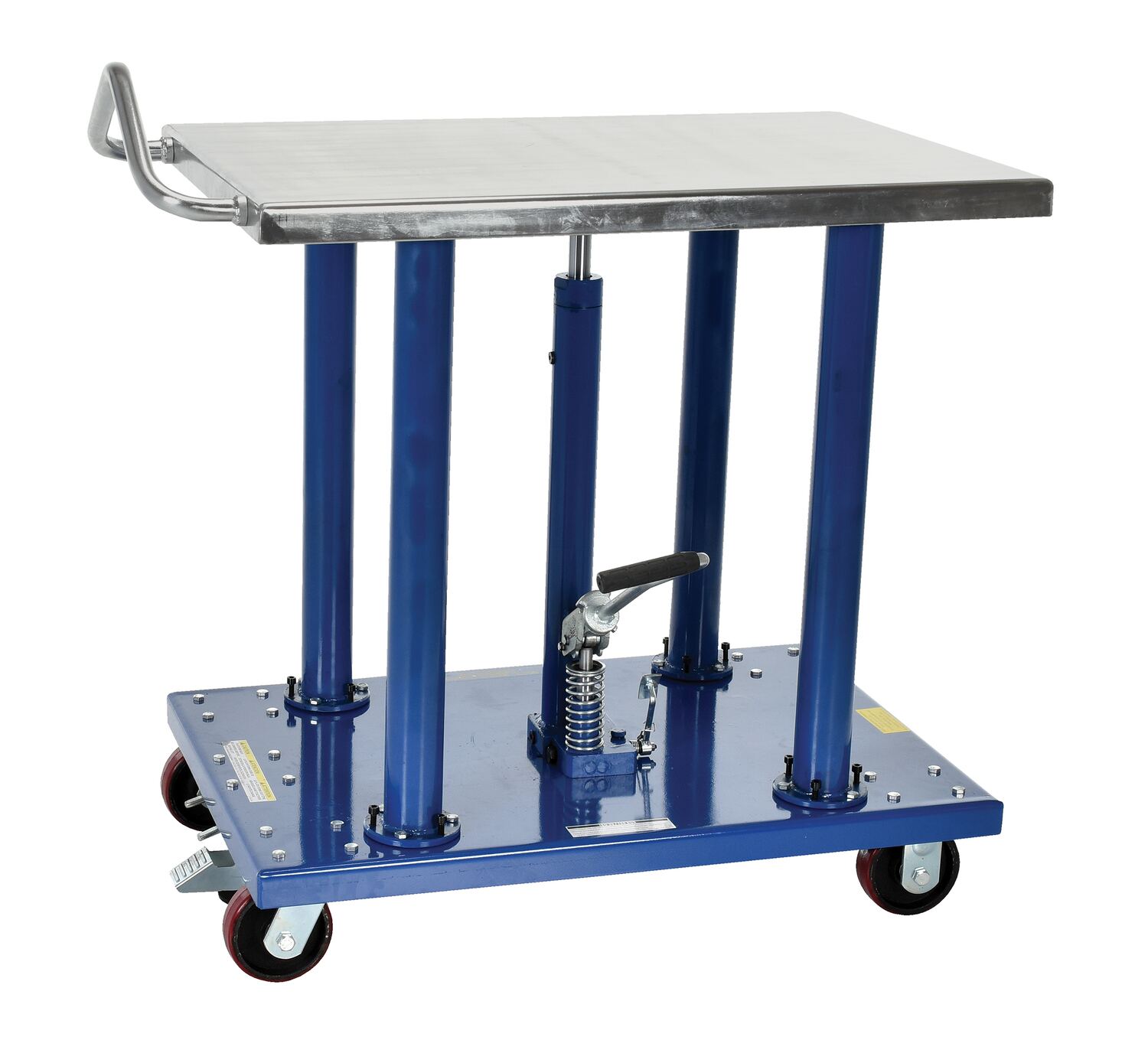 Steel Hydraulic Post Table 24 In. x 36 In. 2000 Lb. Capacity BlueThe Hydraulic post table is built for heavy-duty shop use. This post table is good for many material handling uses including: lifting dies and castings, moving machine parts, positioning welders work, leveling feed material for pump presses, conveyors and press brakes, and similar material handling jobs. The posts are telescoping to help stabilize and support loads during operation. Table includes four casters; two locking swivel with brakes and two rigid. The light duty-units feature a single-speed foot pump. All foot pumps include a down speed control valve for safe platform lowering.