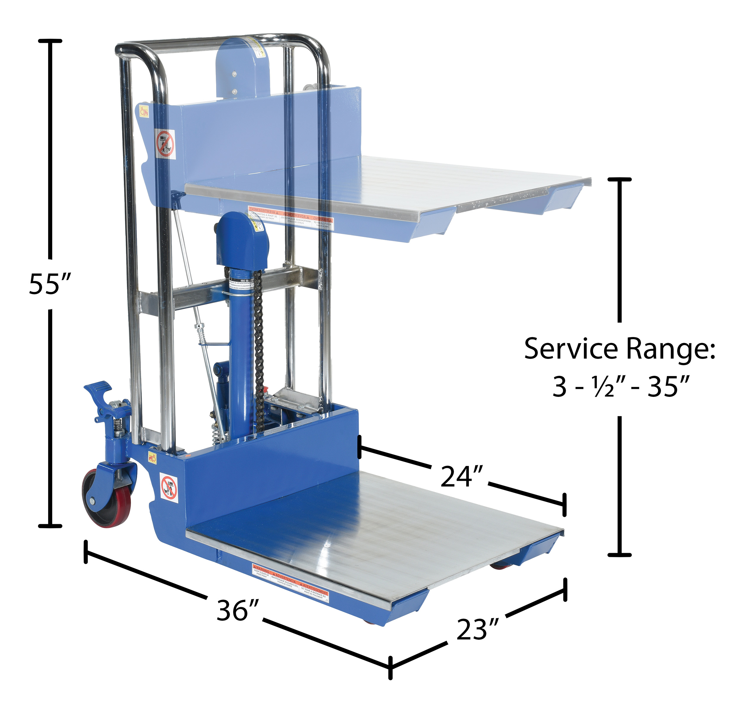 Steel Portable Welded Hydraulic Hefti-Lift 880 Lb. Capacity BlueThe Hefti-Lift units provide reliable powerful lifting when moving and positioning loads. The manual hydraulic foot pump yields 1" of platform travel per stroke. The units roll smoothly on two rigid and two swivel poly-on-steel casters with foot operated brake. The units are designed of welded steel construction with chrome platform uprights. Each fork is 4."W x 2."H, the fork length is the same as the platform length. Overall fork width is 22". Not for use with pallets.
