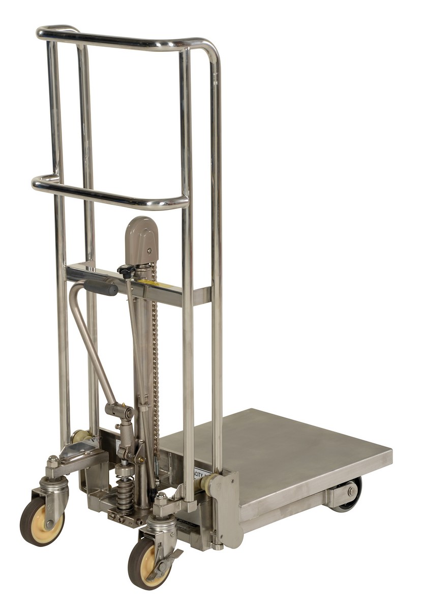 Stainless Steel Hydraulic Hefti-Lift 35-13/16 In. x 52-1/8 In. 450 Lb. Capacity SilverThe Hefti-Lift Stainless Steel units are compact, lightweight, and capable of turning in a small radius when space is limited. A built-in automatic load check valve is included for improved safety. Units provide reliable powerful lifting when moving and positioning loads. The manual hydraulic foot pump yields. The units roll smoothly on two rigid and two swivel poly-on-steel casters with foot operated brake. Each\ fork is 4."W x 2."H, the fork length is the same as the platform length. Overall fork width is 22". Not for use with pallets.