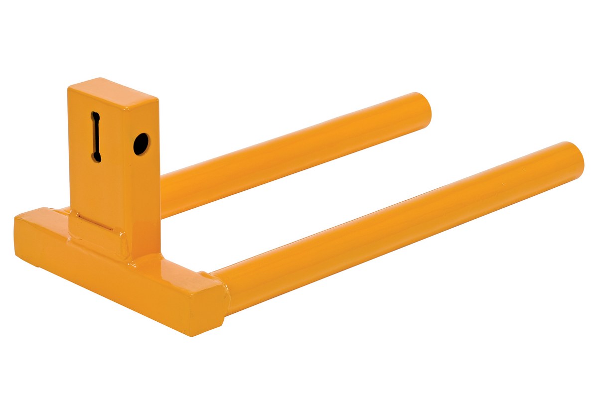 The double spindle attachment is designed of a strong construction for lifting rolls of material and other hollow cylinder objects. A simple installation allows the user to obtain immediate use and diminishes the grind of bending and lifting heavy objects. A bright yellow finish promotes safety and visibility while transferring units.