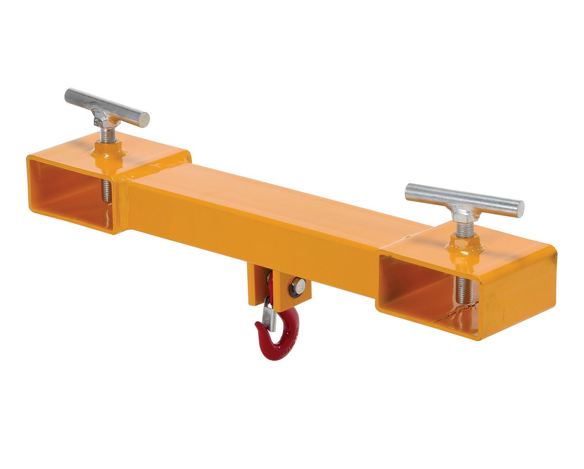 The hook attachment is designed of a strong construction for lifting awkward heavy products. A simple installation allows the user to obtain immediate use of the hook and start maneuvering products. A bright yellow finish promotes safety and visibility while transferring units.