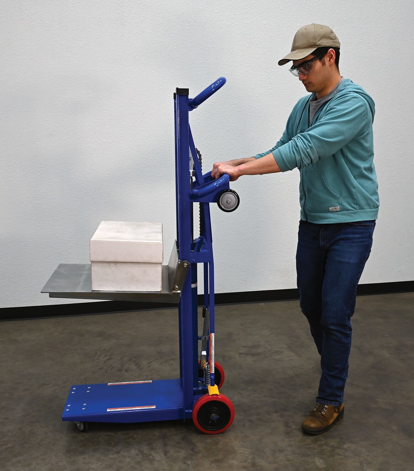 Steel Hydra Lift Cart 33-3/4 In. x 20-1/2 In. 750 Lb. Capacity BlueThe hydra cart transports loads in the lowered position and maneuver work materials to an ergonomic height, which is ideal in compact work areas. It's safe and easy for one person handling of loads and an efficient way to unload heavy objects from semi-trailers. The rugged steel construction allows for many years of service. The dependable precision built hydraulic system is activated by an easy action foot lever. The additional rollers on the handle make loading into a delivery truck easy. A single wheel brake comes standard.