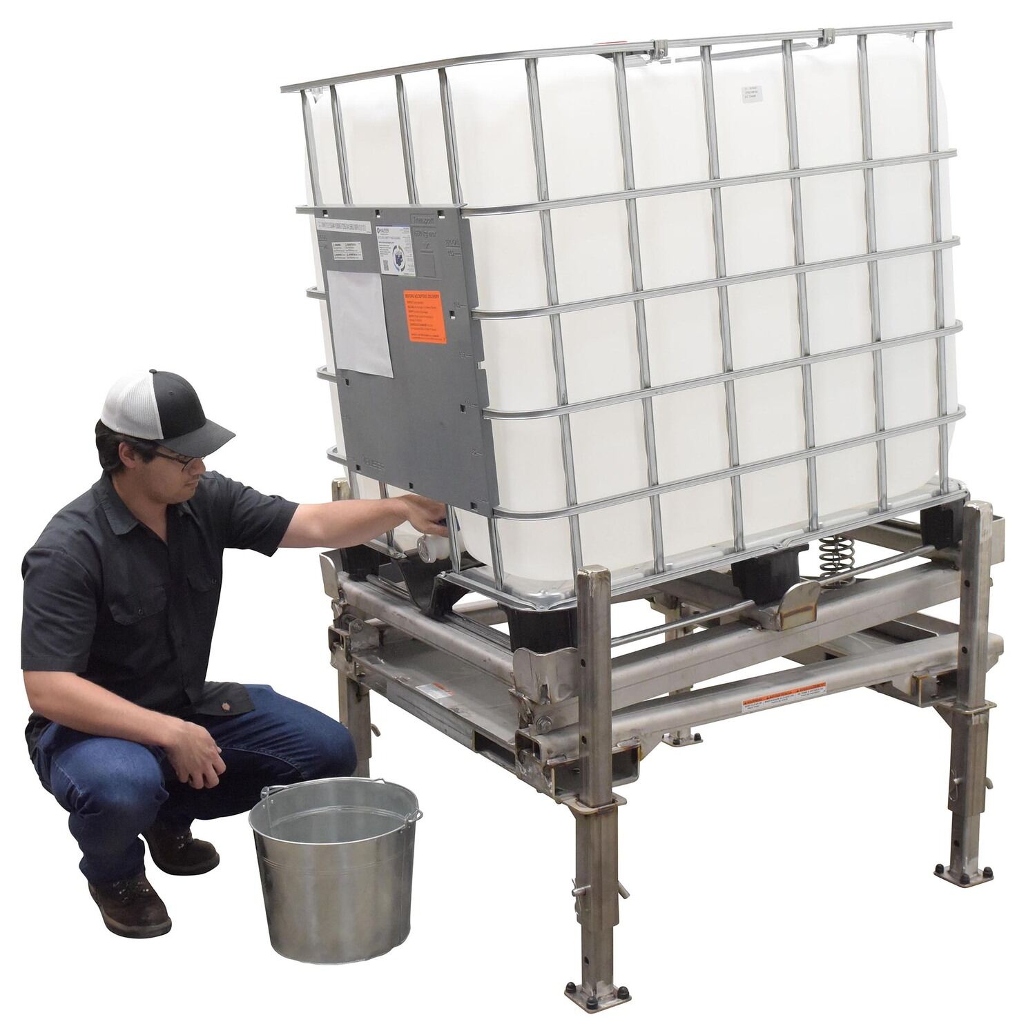 An intermediate bulk container tilt support stand is designed to provide a secure tilting of containers for complete draining. Anchor all 4 legs to the ground with 3/8" X 4" (L) anchor bolts. The adjustable height of the stand allows for easy access to valve connections and minimizes user bending and twisting. To use, simply place the container on the stand. When the container is in the secure position, start the draining process. As the fluid flows from the container, the rear of the stand platform will rise up creating an angle for a better release of fluids.