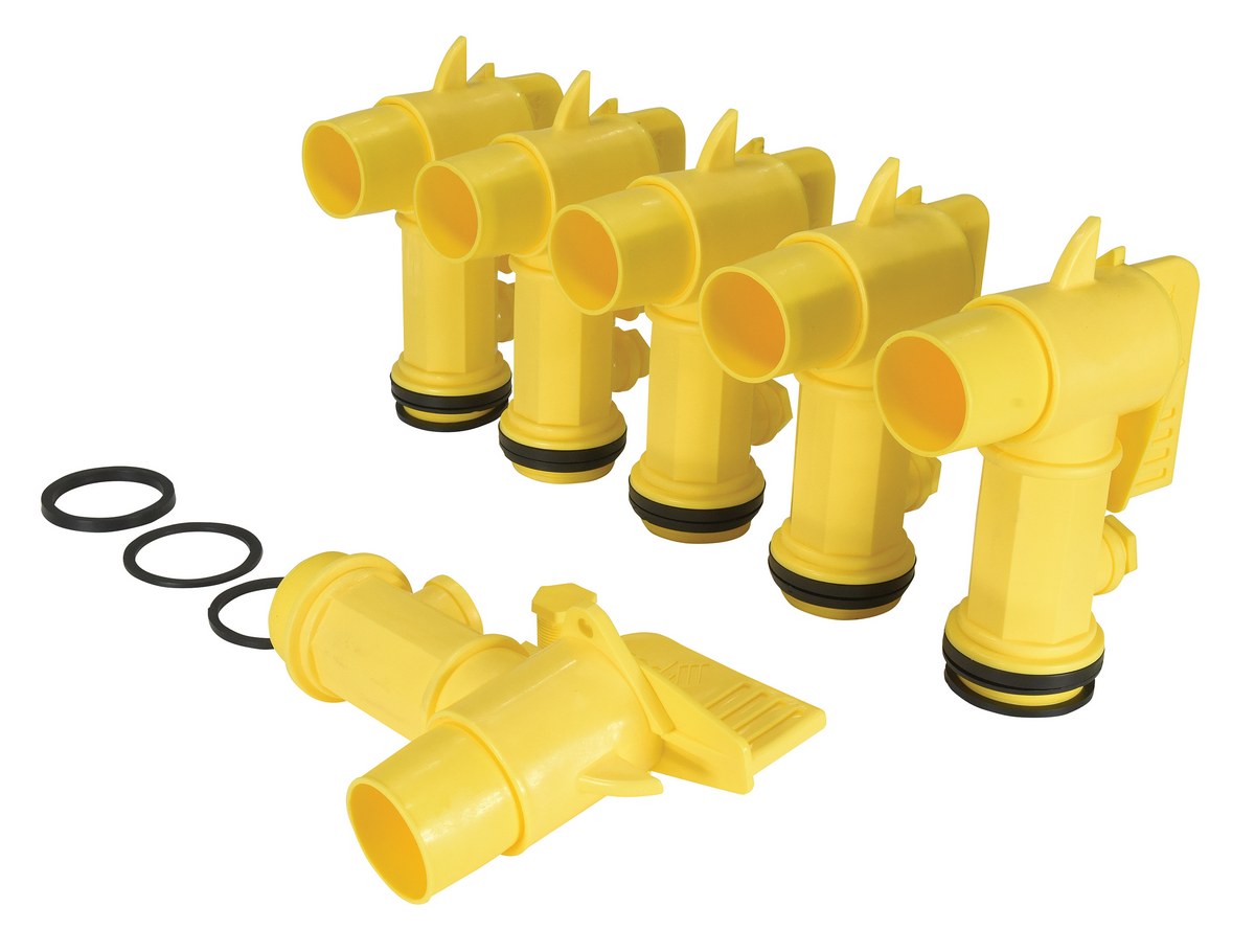 Polyethylene Bung Jumbo Manual Drum Faucet 2 In. 6 Pack YellowQuickly and easily dispense drum contents with this manual drum faucet. The jumbo drum faucet is ideal for dispensing viscous, non-corrosive flammables such as adhesives, paint, heavy oils, grease, and varnish. Padlock not included. Integral hook allows user to hang pail on faucet and comes with a non-adjustable nozzle. Includes port for addition of drum level gauge (sold separately) and a variety of gaskets to fit different kinds of drums.