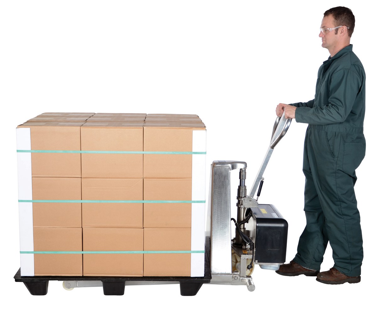 Stainless Steel DC Powered Tote Lift 63 In. x 26-3/4 In. x 46 In. 2000 Lb. Capacity BlueThe tote lifter is designed to lift open bottom skids, boxes, and baskets. Lifter is DC power with rocker switch to raise or lower. This DC powered unit includes an on-board battery charger. The side stabilizers lock lift in place when load is raised over a certain height.