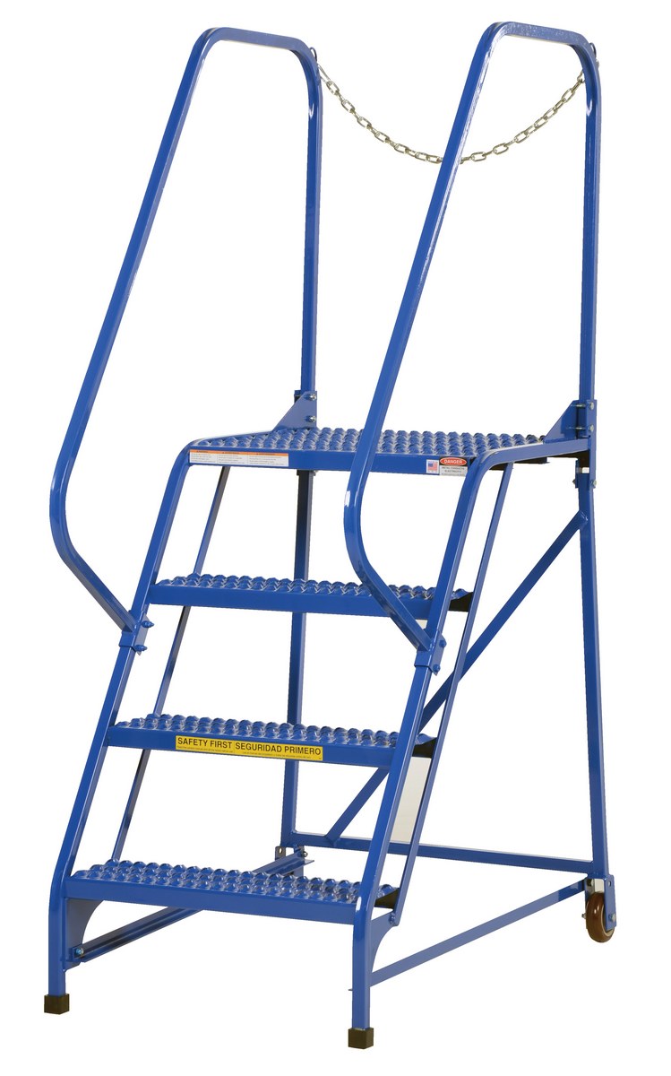 Steel Maintenance Ladder 58 Degree 4 Grip Strut 24 In. Step Width 350 Lb. Capacity BluePortable maintenance ladder for use around a variety of stores and inventory rooms. Constructed of square tubing framework, which handles uniform capacities up to 350 lbs. hand railing provides user safety while ascending or descending the unit. Distance between steps is 10". Powder coated finish for baked in added toughness.