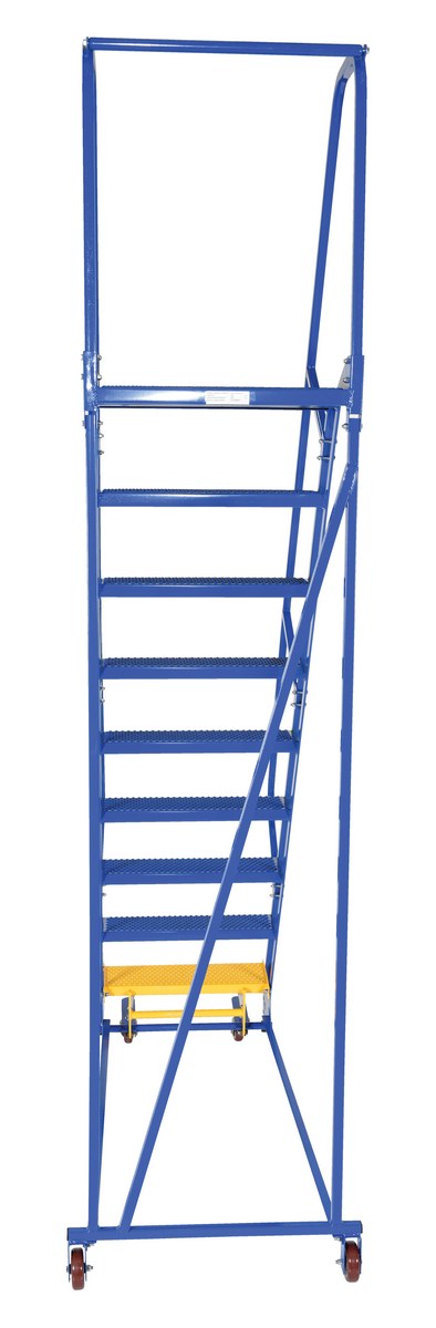 Steel Standard Slope Ladder 58 Degree 9 Perforated 23-9/16 In. Step 350 Lb. Capacity BlueThe standard slope ladder is a portable warehouse ladder for every-day use applications. Perforated steps, handrail included, welded square tubular steel construction with powder-coat blue finish. Rubber feet provided for floor protection. Unit has bottom step lock casters for safe use when climbing.