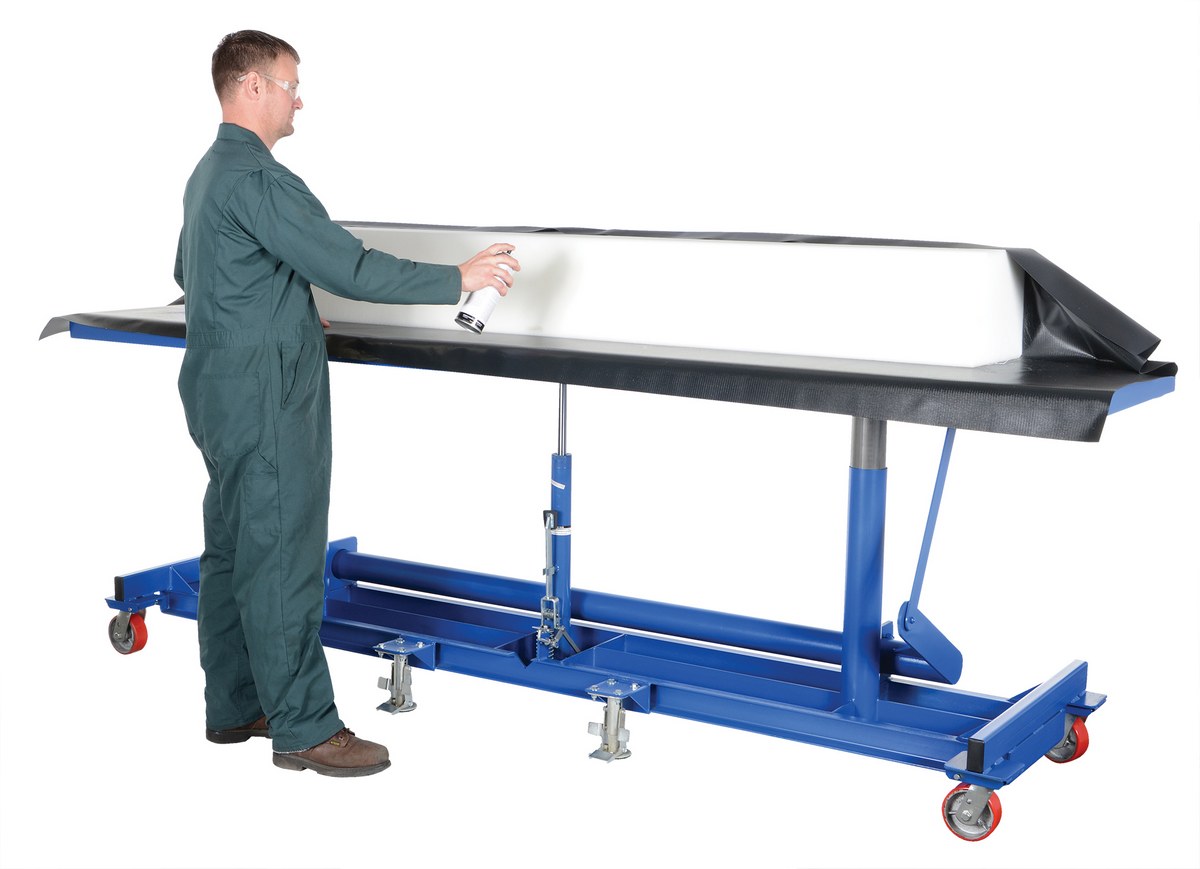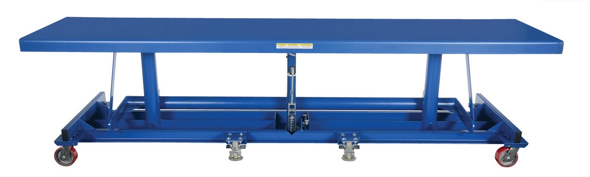 Steel Ergonomic Long Deck Cart 120 In. x 30-1/4 In. x 31 In. 2,000 Lb. Capacity BlueThe long deck cart is perfect for sheet and strip handling as well as ergonomic load positioning. The platform height is adjusted with manual hydraulic foot pump. Unit comes standard with four (4) swivel poly-on-steel casters and dual floor locks.