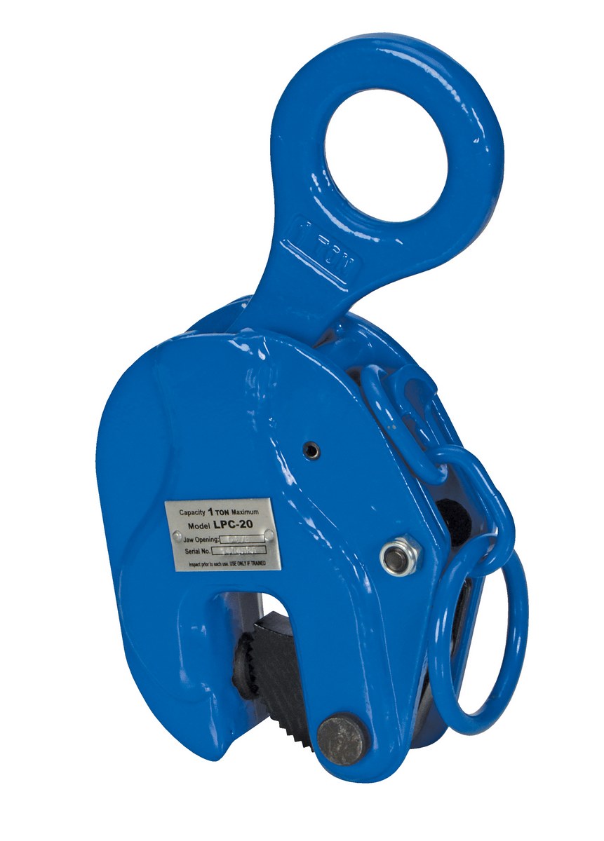 Steel Vertical Positive Locking Plate Clamp 10 In. x 3 In. x 5 In. 2000 Lb. Capacity BlueThe vertical positive locking plate clamp grips a sheet until release ring is pulled. Serrated gripper is hardened tool steel. Forged head and gear. Lift only one (1) clean, oil free plate at a time. Safety factor is 2 to 1. Not designed to use on stainless steel or aluminum plates. For use with materials with a surface hardness to 30 RC (300 HB).