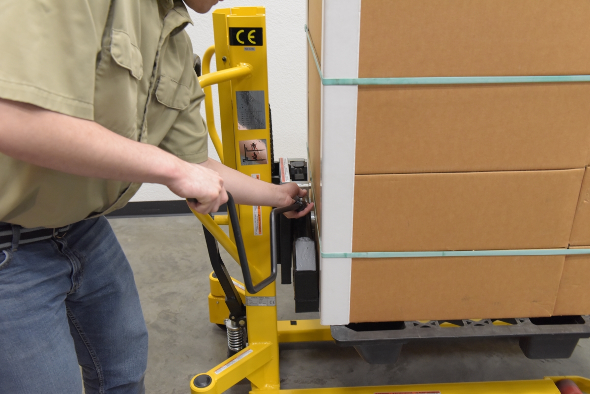 Steel Lift Tilt Truck 21 in x 45 in Forks 1500 lb Capacity Yellow/BlackA lift and tilt pallet truck is an outstanding addition to a variety of production environments. The hand pump lever functionality gives the user control over the precise height movements of the forks. With a wide service range, items both large and small can be loaded and unloaded at a height that best fits the users preference. For items that may need added stability, the tilting function is available. The tilting function can be used up to 20 degrees tilt for extra steadiness. Steel construction with a powder coat finish for added baked in toughness. For use with open bottom pallets and skids only.