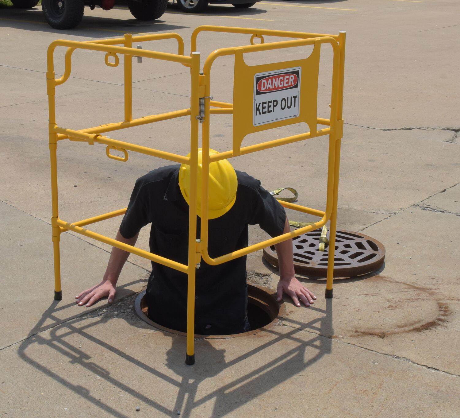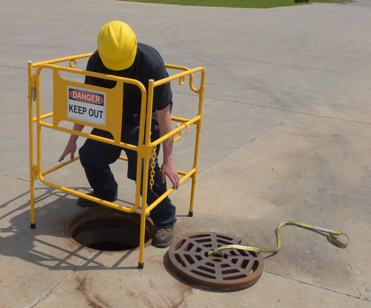 Steel Manhole Guard Rail with Aluminum Sign 31 In. x 30 In. Danger Keep Out Sign Message Yellow
