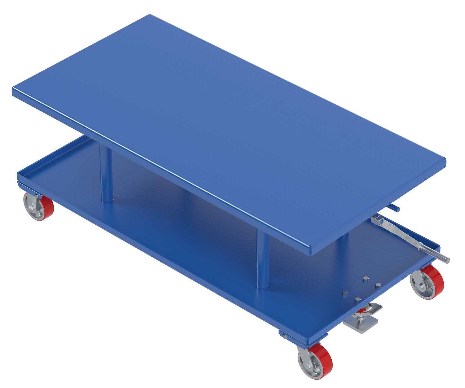 Steel Low Profile Post Table 30 In. 60 In. 2000 Lb. Capacity BlueThe mechanical post table is an adjustable portable table that is well suited for a wide variety of material handling applications. It moves smoothly on two rigid and two swivel poly-on-steel casters. Includes bolted on adjustable floor lock. Provides positive height adjustment without a downward shift. It features a two-speed manual gear mechanism to move heavy loads.