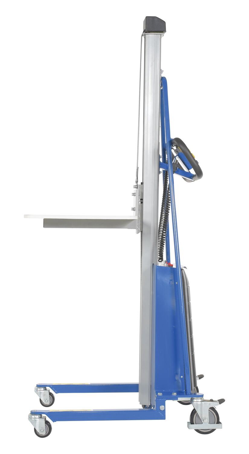 Steel DC Powered Work Positioner 35-1/2 In. x 23-5/8 In. x 79-1/2 In. 550 Lb. Capacity BlueThe Vestil work positioner takes the strain out of any lifting job! While many competitor models are big and bulky, the Vestil positioner is specifically built to go down narrow aisles and around confined spaces. With a platform height that is adjustable with a DC powered lift; getting to the perfect height is quick and easy. Two (2) 3" swivel load casters and two (2) 5" total locking swivel steering polyurethane casters standard. Includes two (2) 12V AGM batteries with an integral battery charger.