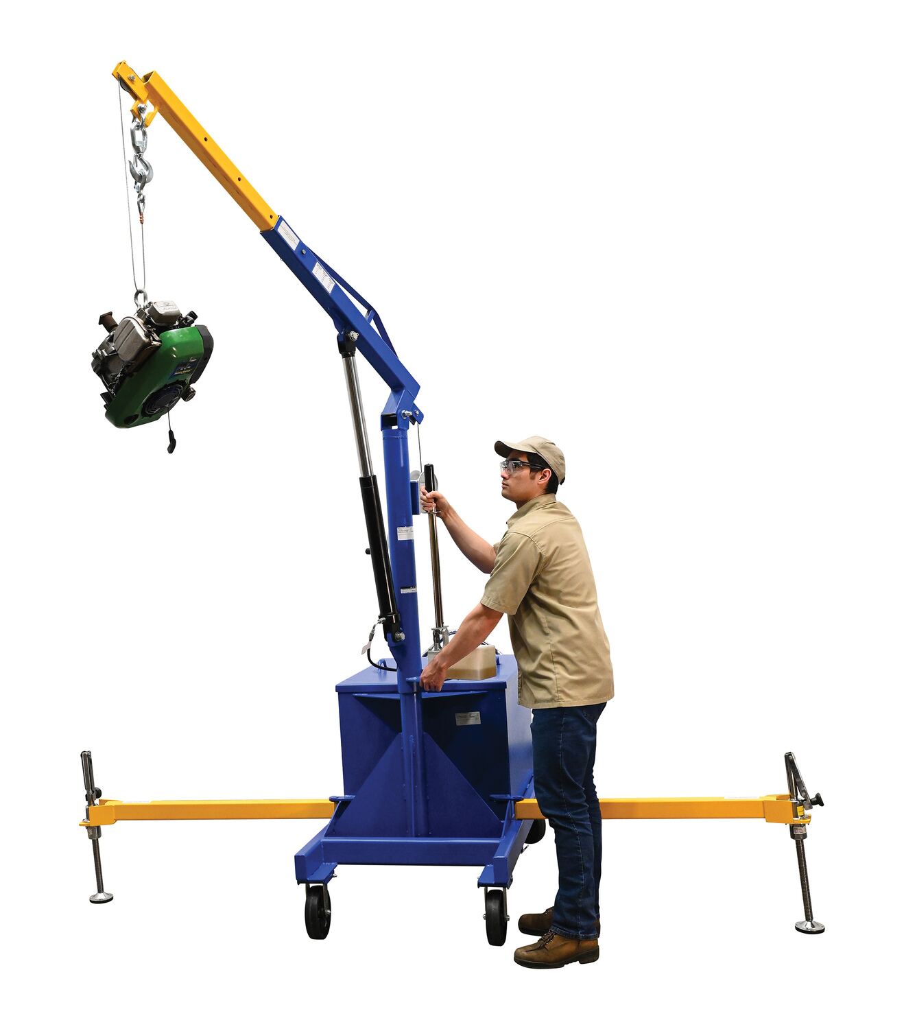 Steel Portable Cantilever Hoist 113-3/8 In. x 35-11/16 In. x 89 In. 2000 Lb. Capacity BlueThe portable Cantilever hoist is built for heavy lifting. The swivel crane makes for simple side loading and controlled lowering. Maximum arm length beyond the frame is 50-3/8". Unit is available with or without counter balancing ballast. Painted finish.