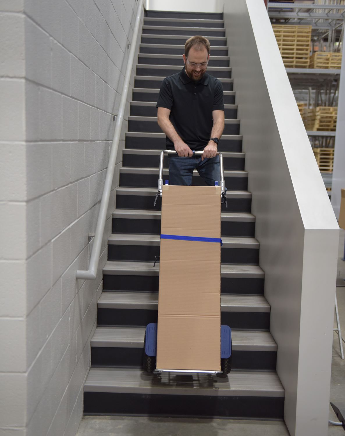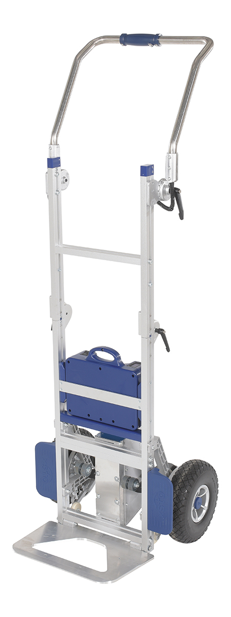 Aluminum Powered Stair Climber 22 In. x 21 In. x 61 In. 350 Lb. Capacity BlueWhen objects are required to be moved up or down flights of stairs, the powered stair climber is the perfect asset. With the large ergonomic handle and tall upright aluminum alloy structure, a single user can transport goods with ease. A wide platform base gives the user the opportunity to transfer a variety of items whether they are heavy, light, large or small. When transferring goods down a set if stairs, the brake is automatically applied to ensure safety and consistent speed of movement. The powered design increases user safety and minimizes the labor associated with moving awkward items. This powered stair climber has two raise/lowering speeds. When not in use, the cart folds into a very compact design that is perfect for transporting in vehicles or storing away in closets. Large polyurethane wheel make traversing over a variety of surfaces as simple as can be.