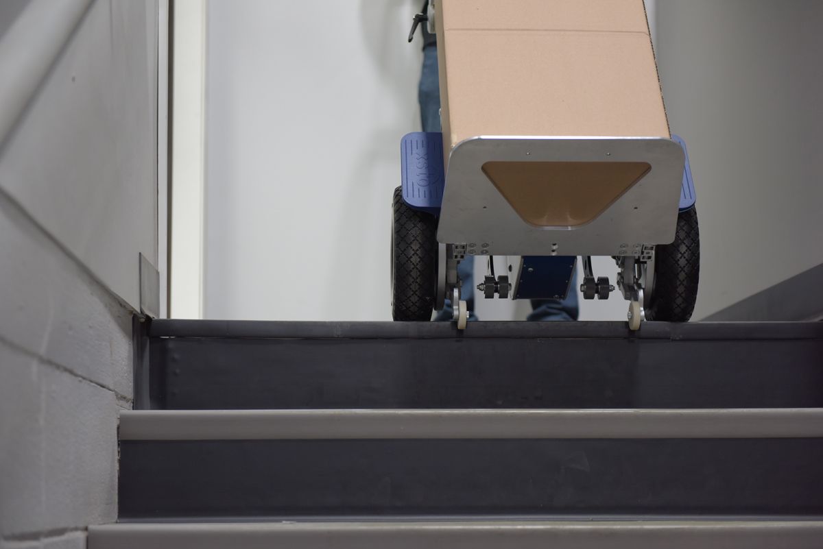 When objects are required to be moved up or down flights of stairs, the powered stair climber is the perfect asset. With the large ergonomic handle and tall upright aluminum alloy structure, a single user can transport goods with ease. A wide platform base gives the user the opportunity to transfer a variety of items whether they are heavy, light, large or small. When transferring goods down a set if stairs, the brake is automatically applied to ensure safety and consistent speed of movement. The powered design increases user safety and minimizes the labor associated with moving awkward items. This powered stair climber has two raise/lowering speeds. When not in use, the cart folds into a very compact design that is perfect for transporting in vehicles or storing away in closets. Large polyurethane wheel make traversing over a variety of surfaces as simple as can be.