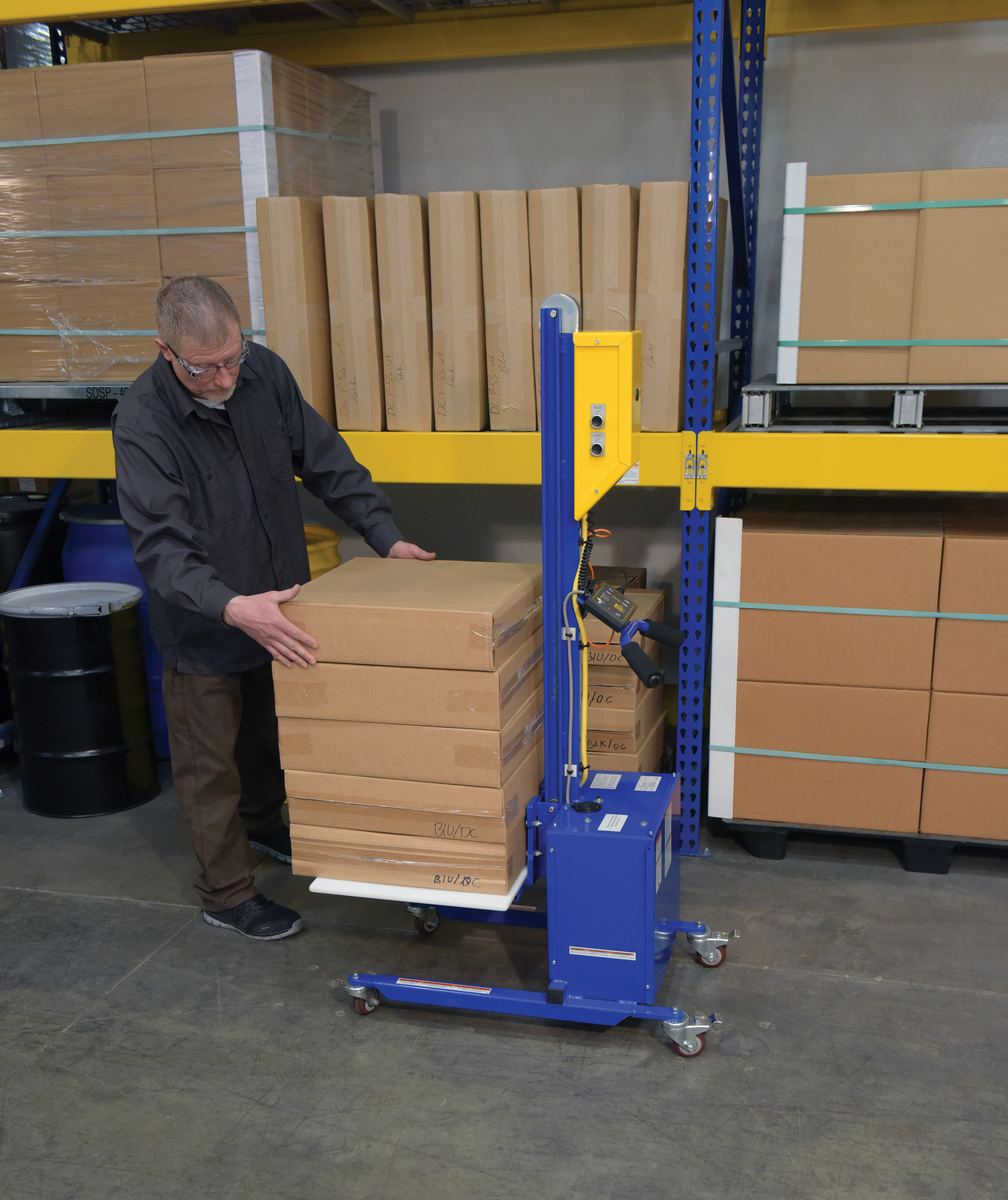 Steel DC Powered Quick Lift with Auto Height Indexer 175lb Capacity BluePowered quick lift units transport and position loads quickly and efficiently. Featuring a low profile design with dual push handles for maneuvering in narrow aisles and confined spaces. The auto height indexer lets the platform be unadjusted to the most suitable height. When unloading many boxes, as one box is taken off of the platform, the height of the platform automatically re-adjusts back to the set proper height. This minimizes bending and keeps the user in a more ergonomic position throughout the process. Unit is powder coated for baked in added toughness.