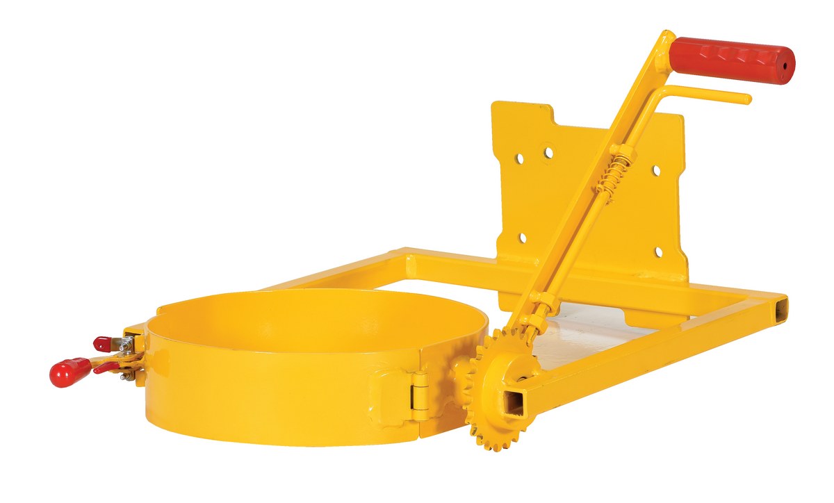 The pail attachment is designed for lifting, rotating and dumping pails. The unit is adjustable to accommodate pail sizes. The manual dumper lets the user unload the pail at the rate that best fits the conditions. A simple installation allows the user to obtain immediate use and diminish the amount of bending and lifting of heavy objects. A yellow finish promotes visibility and safety while transferring units.