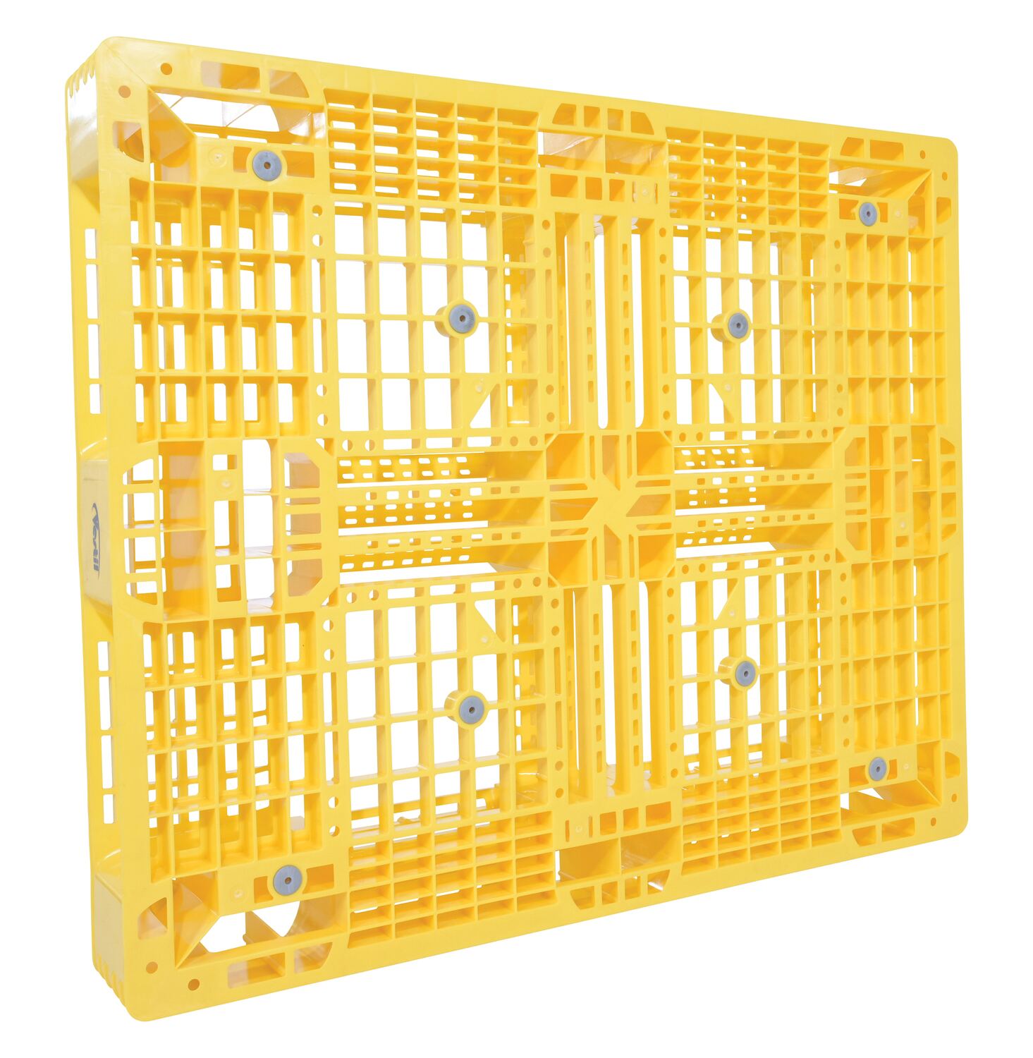 High Density Polyethylene Pallet 39-3/8 In. x 47-3/8 In. x 6 In. 8000 Lb. Capacity YellowPlastic pallets are stackable for efficient storage. Made of high-density virgin polyethylene for long life. Plastic pallets are maintenance free and safer to handle than wooden pallets. Features a four-way entry and serrated deck with holes for drainage. Plastic pallets are ideal for export, pharmaceutical, medical, and food applications.