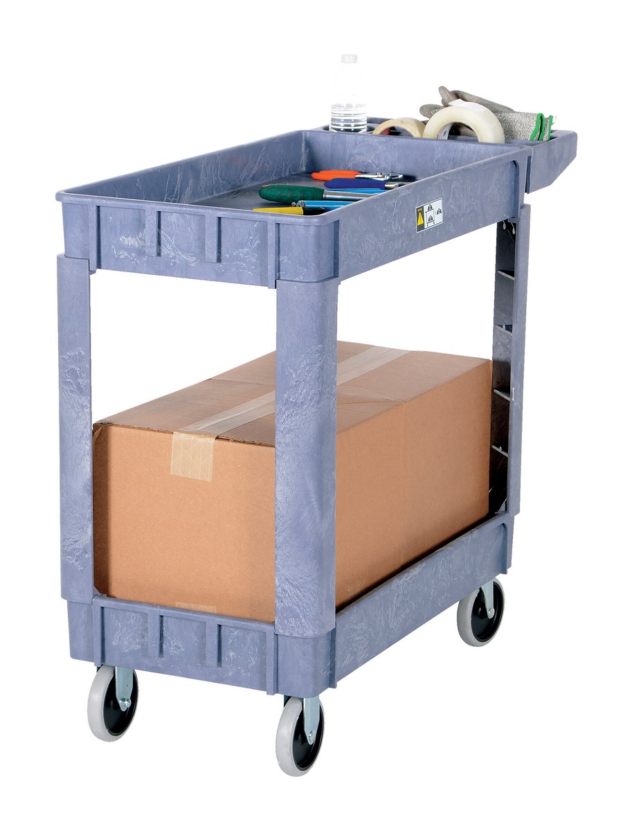 This plastic utility service cart is constructed from durable yet lightweight structural foam plastic. Choose the two (2) shelf design to accommodate your application. Deep lips prevent parts from rolling off. Ideal for mail rooms, shipping docks, grocery stores, warehouses, and inventory rooms.