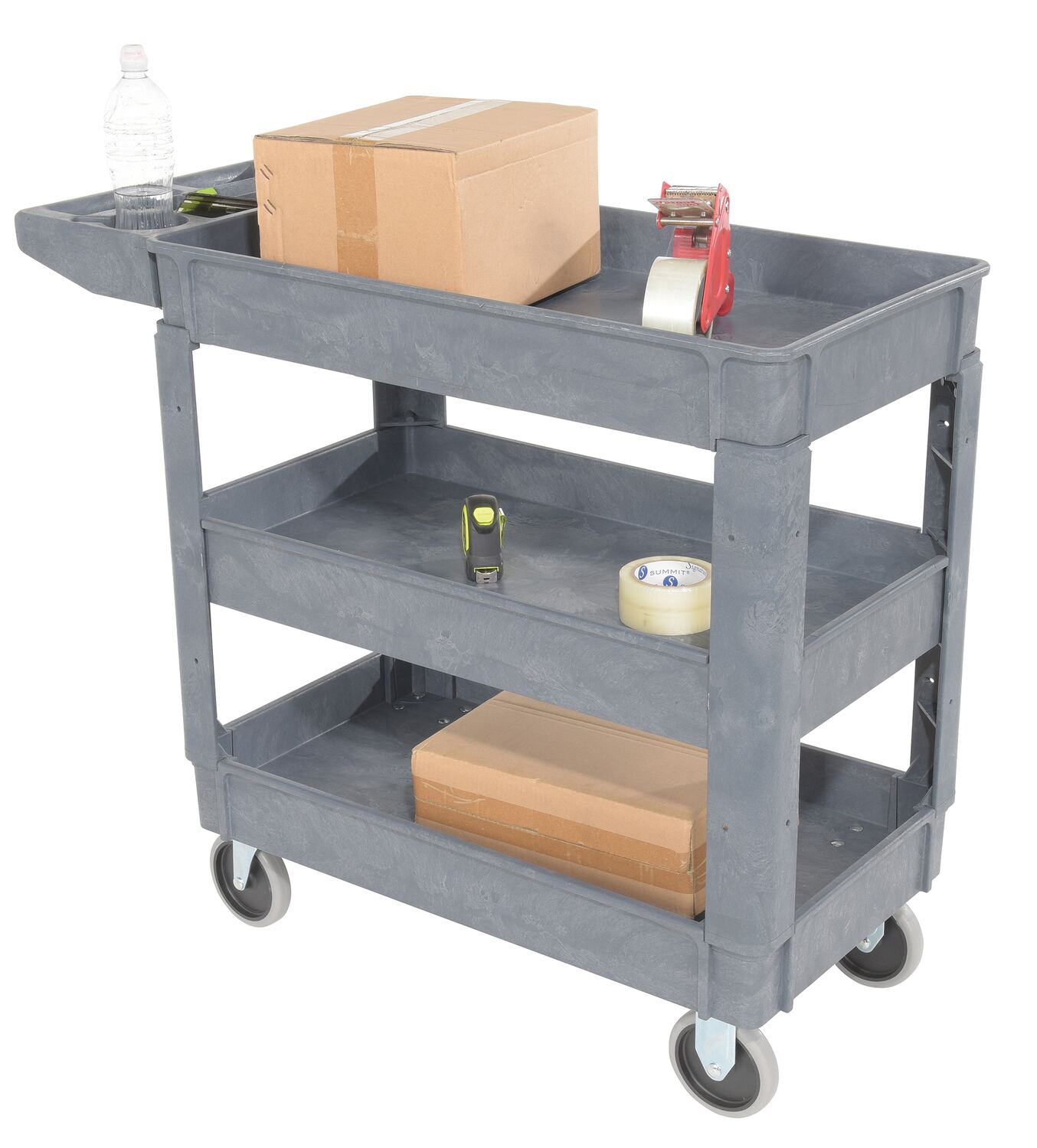 Plastic Utility Service Cart 3 Shelves 40 In. x 18-1/2 In. x 33-1/2 In. 550 Lb. Capacity GrayThis plastic utility service cart is constructed from durable yet lightweight structural foam plastic. Choose the three (3) shelf design to accommodate your application. Deep lips prevent parts from rolling off. Ideal for mail rooms, shipping docks, grocery stores, warehouses, and inventory rooms.
