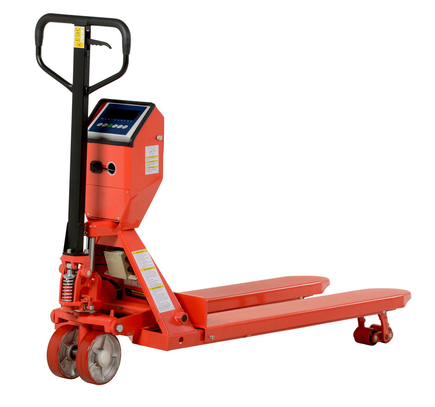 Steel Low Profile Pallet Truck with Scale 64-1/2 In. x 22-3/8 In. x 48 In. 5000 Lb. Capacity RedThe pallet truck with digital scale allows you to weigh your load on the spot for maximum efficiency. The frame uses heavy-duty steel construction for maximum strength and durability. The unit is very user friendly and is suitable for low height lifting. The built-in scale allows you to weigh your load while it is being handled. The scale is selectable in a variety of increments to adjust to the size of your load. It has keyboard calibration and functional setup with automatic zero capabilities. Digital filtering is used to help compensate for vibration and motion to make the pallet truck with digital scale smooth and accurate. The scale is powered by batteries with AC adapter included. Step approval is also available.