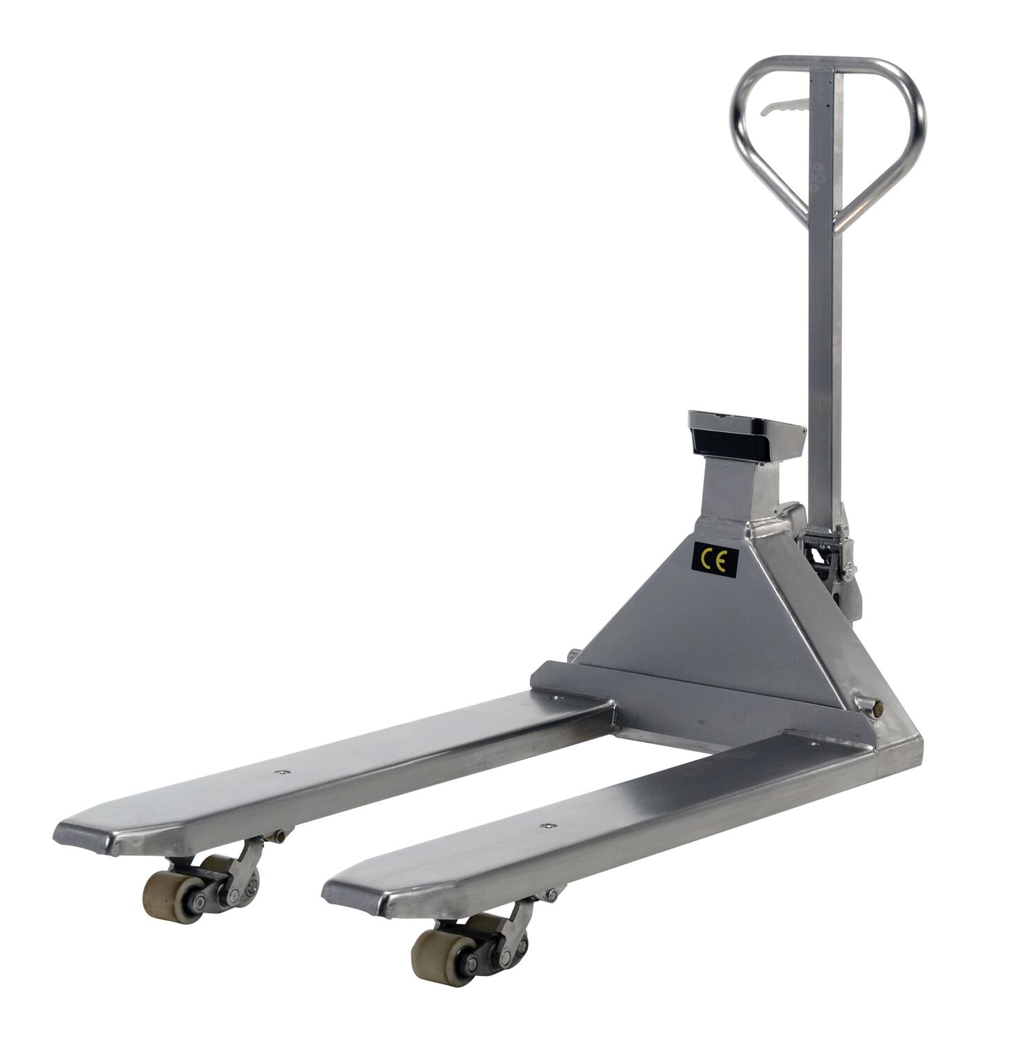 Stainless Steel Low Profile Pallet Truck with Scale 61-43/64 In. x 27 In. x 48-5/8 In. 5000 Lb. Capacity SilverThe pallet truck with digital scale allows you to weigh your load on the spot for maximum efficiency. The frame uses heavy-duty steel construction for maximum strength and durability. This model is very user friendly and is suitable for low height lifting. The built-in scale allows you to weigh your load as you are handling it. The scale is selectable in a variety of increments to adjust to the size of your load. It has keyboard calibration and functional setup with automatic zero capabilities. Digital filtering is used to help compensate for vibration and motion to make the pallet truck with digital scale smooth and accurate. Forks are 7" wide each. Factory calibrated for shipping destination. Scale is powered with 4 C batteries. AC adapter included. Step approval also available.