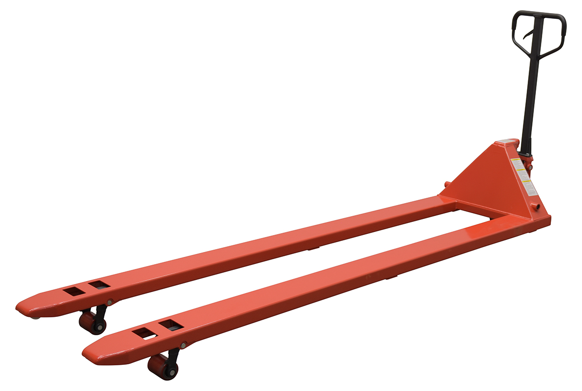 The full featured pallet truck is an economical way for one person to move heavy pallet loads without the use of a fork truck! Includes two (2) articulating steering wheels and two (2) front load rollers. The ergonomic design requires only seventy-five (75) pounds of pulling force when fully loaded. Steering wheels include bearing dust covers for added life. Nose wheels are located on the front edge of each fork to assist in clean pallet entrance and exit. Reinforced triple-formed steel forks provide twice the strength of standard single-formed forks. The unit is equipped with internally mounted solid steel adjustable push rods. The spring loaded handle automatically returns to vertical position when not in use. Hydraulic pump design facilitates easy-access seal replacement. Chrome-plated hydraulic pump piston for long seal life.