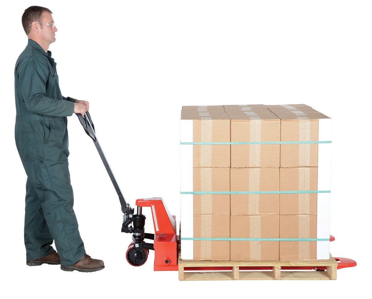 The Low Profile pallet truck can enter a pallet from all four sides. The all steel frame is reinforced to handle heavy loads. Wide loop handle control with lift, neutral, and lower functions provides fingertip control. The unit has lifetime lubricated bearings and a hydraulic system that has a hard chrome plated pump piston with polyurethane seals. The suspension system has heavy-duty thrust bearing. This pallet truck comes complete with adjustable push rods, polyurethane wheels, steel load rollers, and a red powder coat finish.