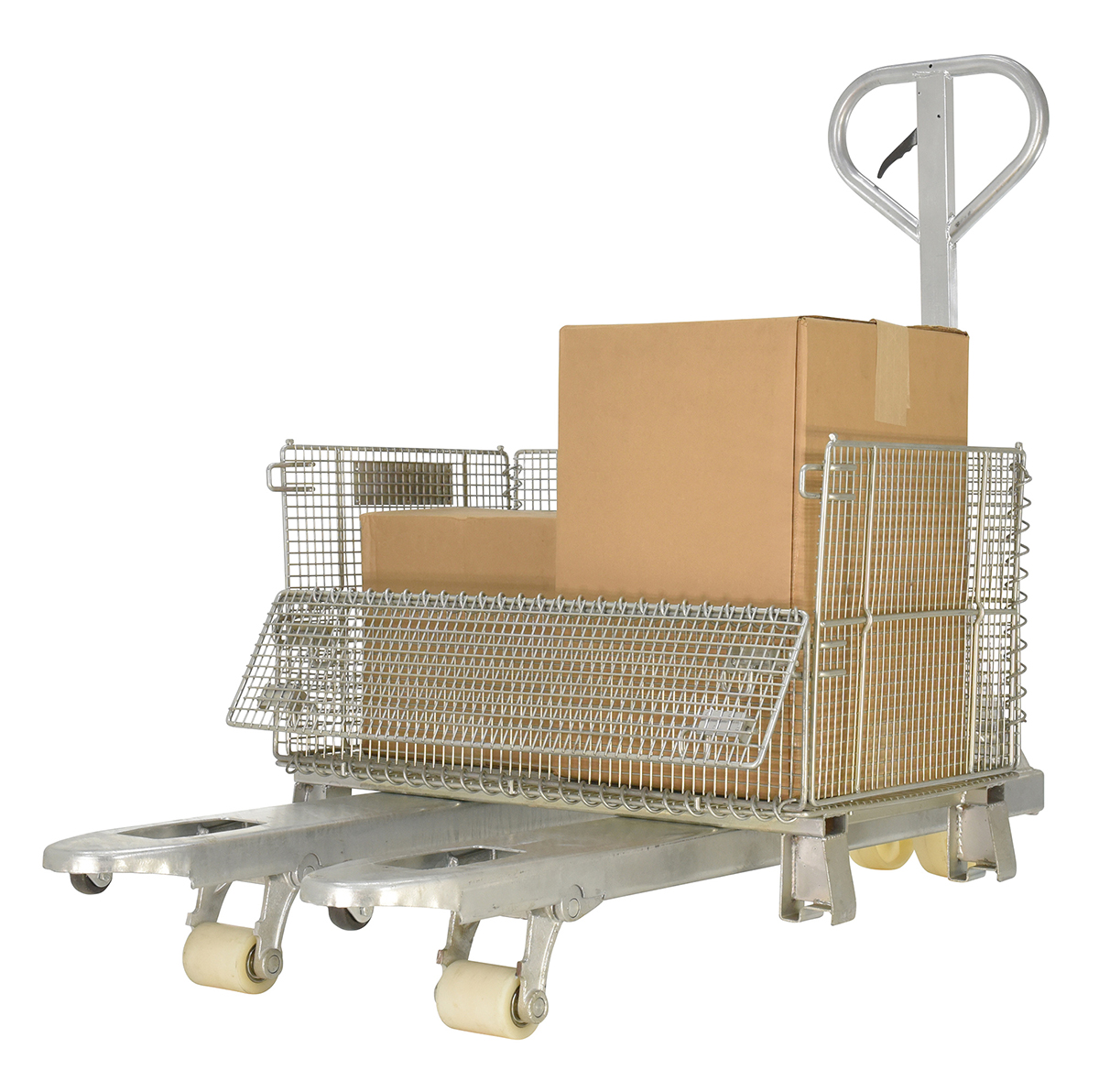 The specialized pallet trucks are ideal for corrosive environments. The pallet truck includes a galvanized finish for strong durability in the harshest of environments. Full-featured pallet trucks were designed for chemical, pharmaceutical, and wash-down applications. 5,500 pounds uniform capacity.