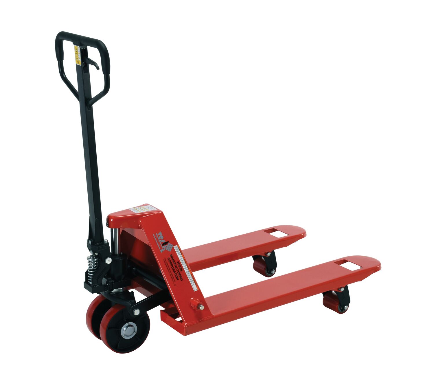 Steel Full Featured Pallet Truck 49-1/2 In. x 27 In. x 48-1/2 In. 5500 Lb. Capacity RedAn economical way for one person to move heavy pallet loads without the use of a fork truck! Includes two articulating steering wheels and two front load rollers. Ergonomic design requires only 75 pounds of pulling force when fully loaded. Steering wheels include bearing dust covers for added life. Nose wheels are located on the front edge of each fork to assist in clean pallet entrance and exit. Reinforced triple-formed steel forks provide twice the strength of standard single-formed forks. Forks are 6." wide each. Equipped with internally mounted solid steel adjustable push rods. Spring loaded handle automatically returns to vertical position when not in use. Hydraulic pump design facilitates easy-access seal replacement. Chrome-plated hydraulic pump piston for long seal life.