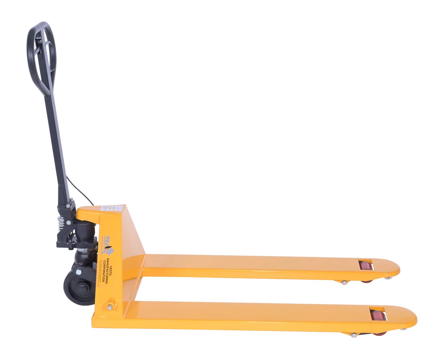 Pallet Truck with Dead Man Brake 66 In. x 27 In. x 49 In. 5500 Lb. Capacity YellowThe pallet truck with hand brake option only moves when you depress the hand brake.
