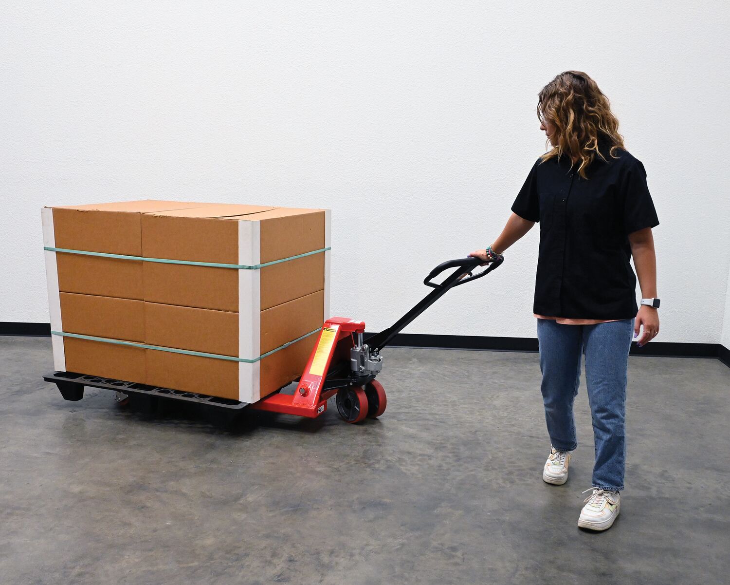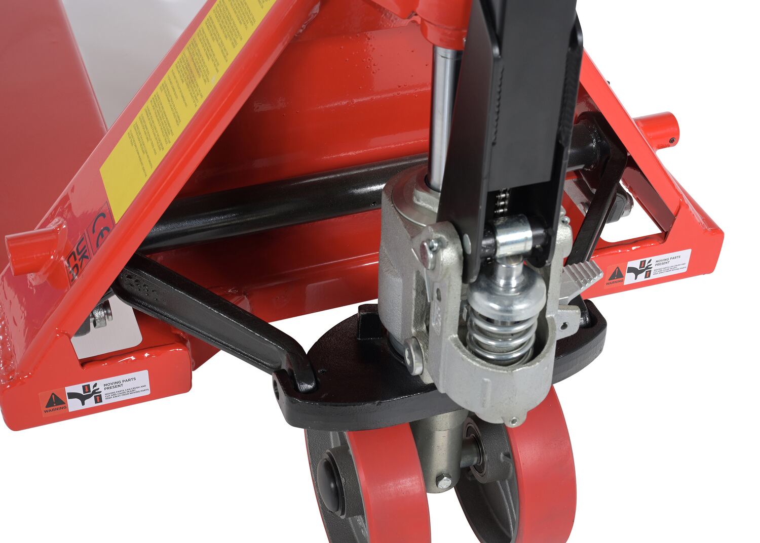 The full featured pallet truck is an economical way for one person to move heavy pallet loads without the use of a fork truck! Includes two (2) articulating steering wheels and two (2) front load rollers. Nose wheels are located on the front edge of each fork to assist in clean pallet entrance and exit. The unit is equipped with internally mounted solid steel adjustable push rods. A chrome-plated hydraulic pump piston supports long seal life, while the hydraulic pump design facilitates simple seal replacement when needed.