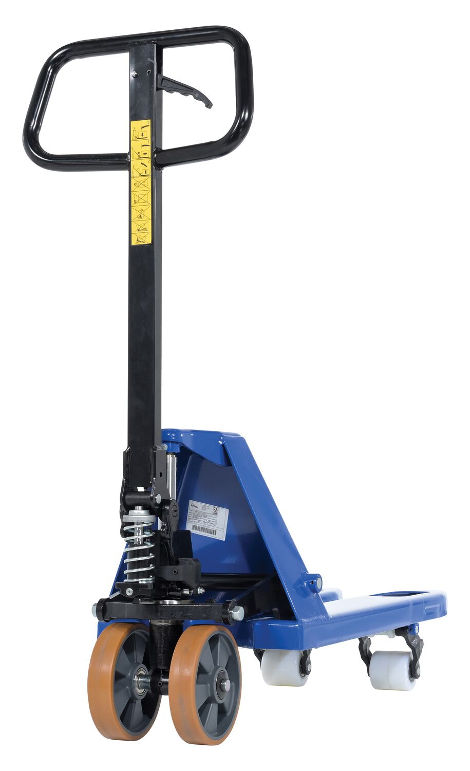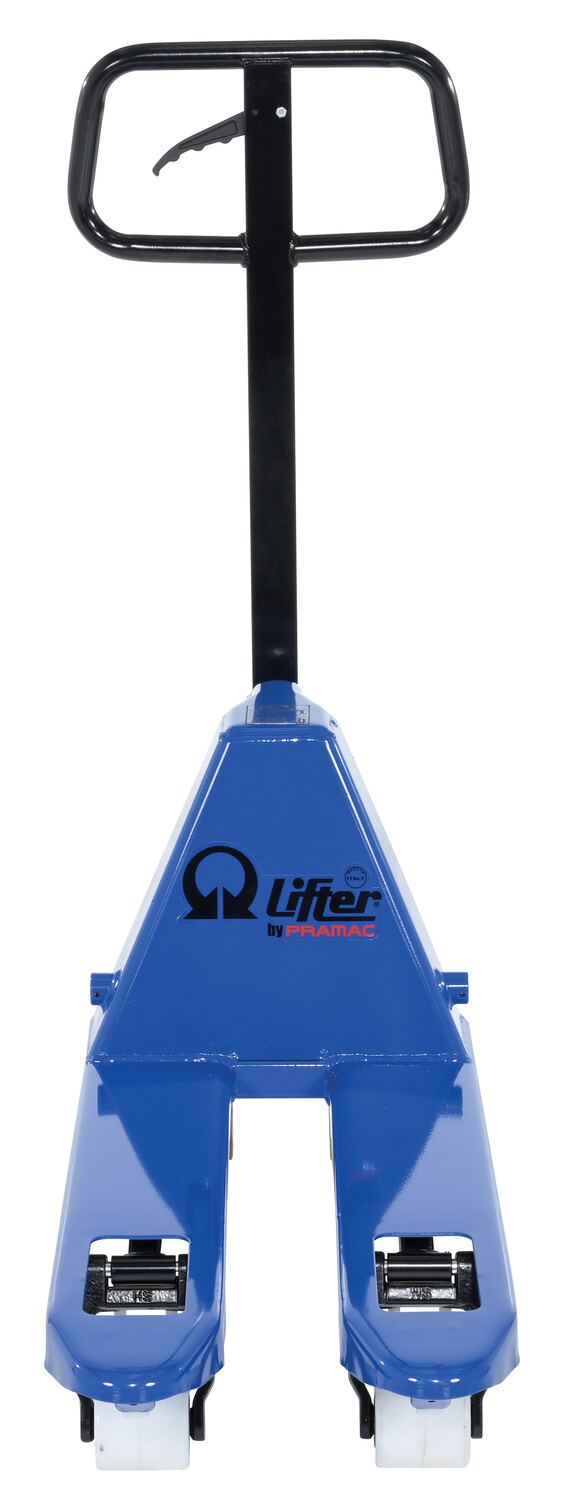 Steel Pramac Mini Hand Pallet Truck Hand Pump 46 In. x 15-3/4 In. x 46 In. 5500 Lb. Capacity Blue/BlackThe mini hand pallet truck is ideal for shipping and dock personnel. The pallet truck is designed of steel for resistance against damage throughout day to day use. A bright finish allows the units to be visible to other personnel, both near and far. The extended steering handle creates a more ergonomically friendly position while distributing products from work area to work area.