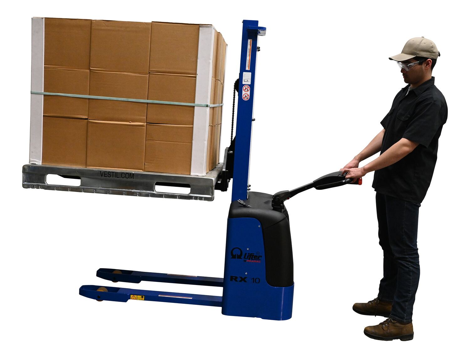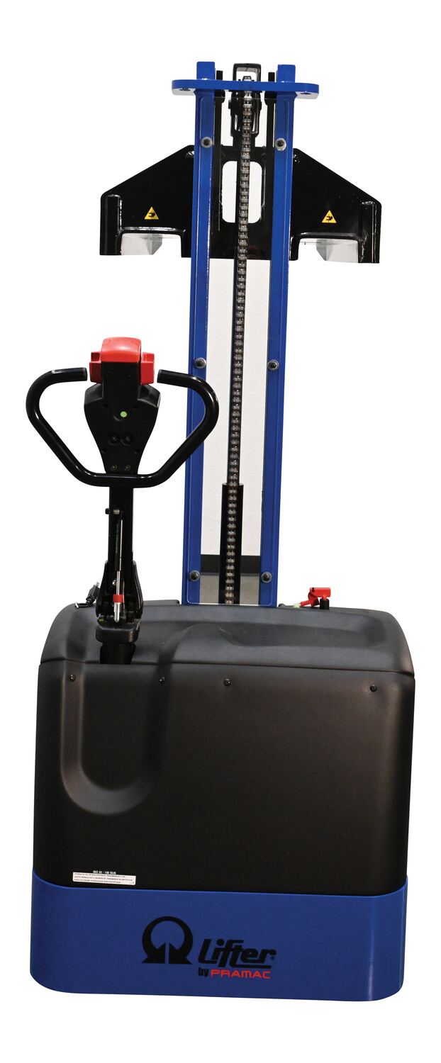 Steel Pramac DC Powered Narrow Mast Stacker Fixed Forks 67 In. x 31 In. x 73-1/2 In. 2200 Lb. Capacity Blue / BlackElectric power drive and lift. Ergonomic handle with a full control and safety system. Features "tortoise" push button for slow motion, a safety punch button with warning buzzer, and on-board battery charger. DC powered with two (2) 12V batteries.