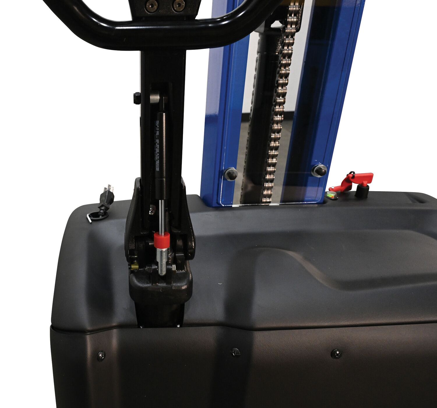 Electric power drive and lift. Ergonomic handle with a full control and safety system. Features "tortoise" push button for slow motion, a safety punch button with warning buzzer, and on-board battery charger. DC powered with two (2) 12V batteries.