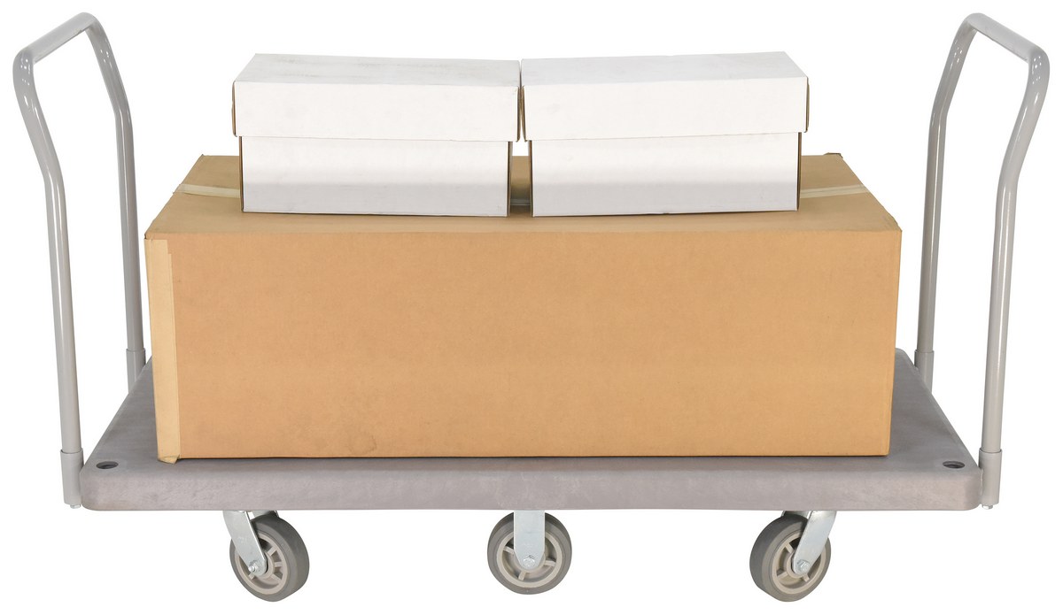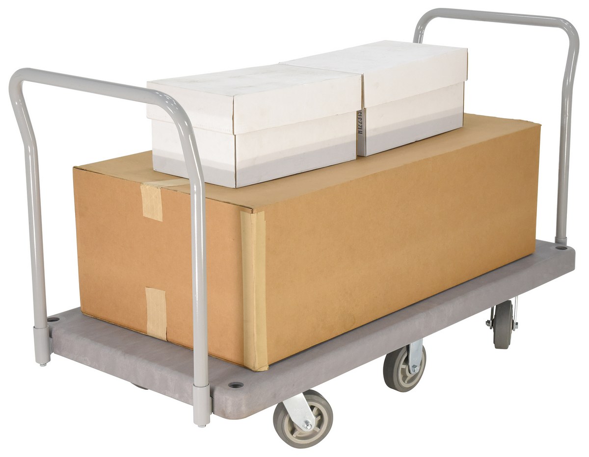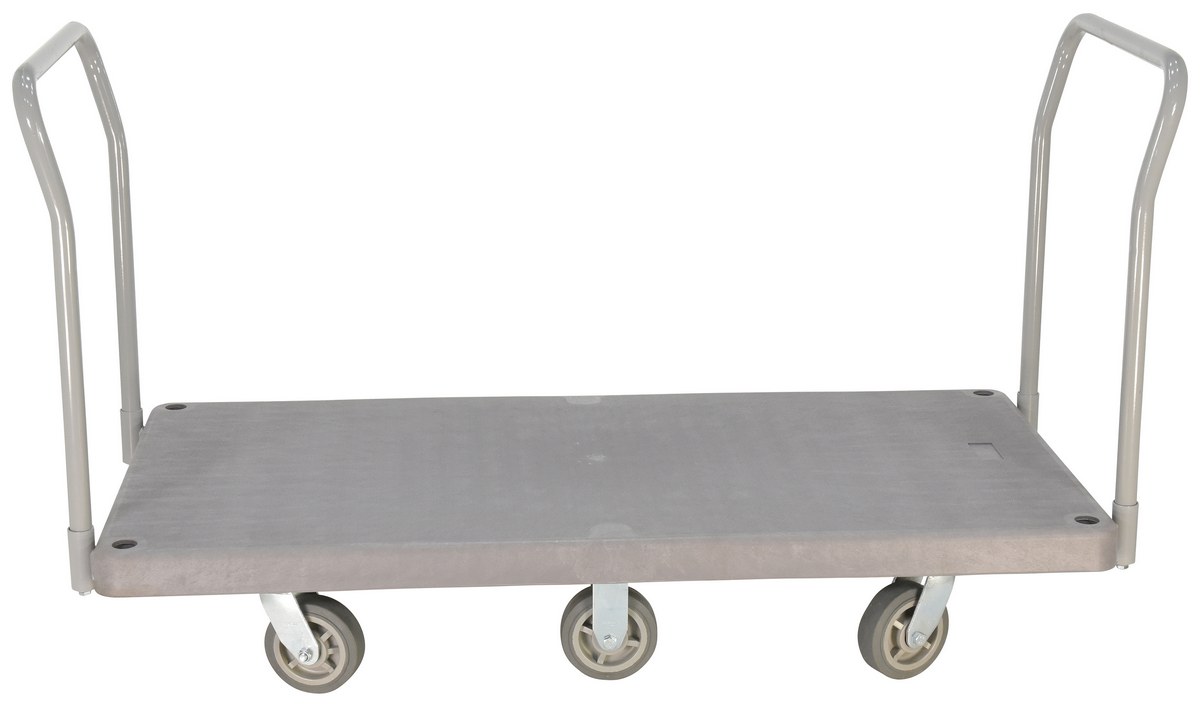 Plastic Heavy Duty Platform Truck 2 Handles 67-1/2 In. x 30 In. x 34 In. 3000 Lb. Capacity GrayThe heavy-duty plastic Platform Truck will not rust, discolor, or warp. Maintenance free and easy to clean. Honeycomb construction is reinforced for longer life. Extra square steel tube underneath platform to reinforce deck strength. This six (6) wheel unit rolls smoothly on polyurethane casters.