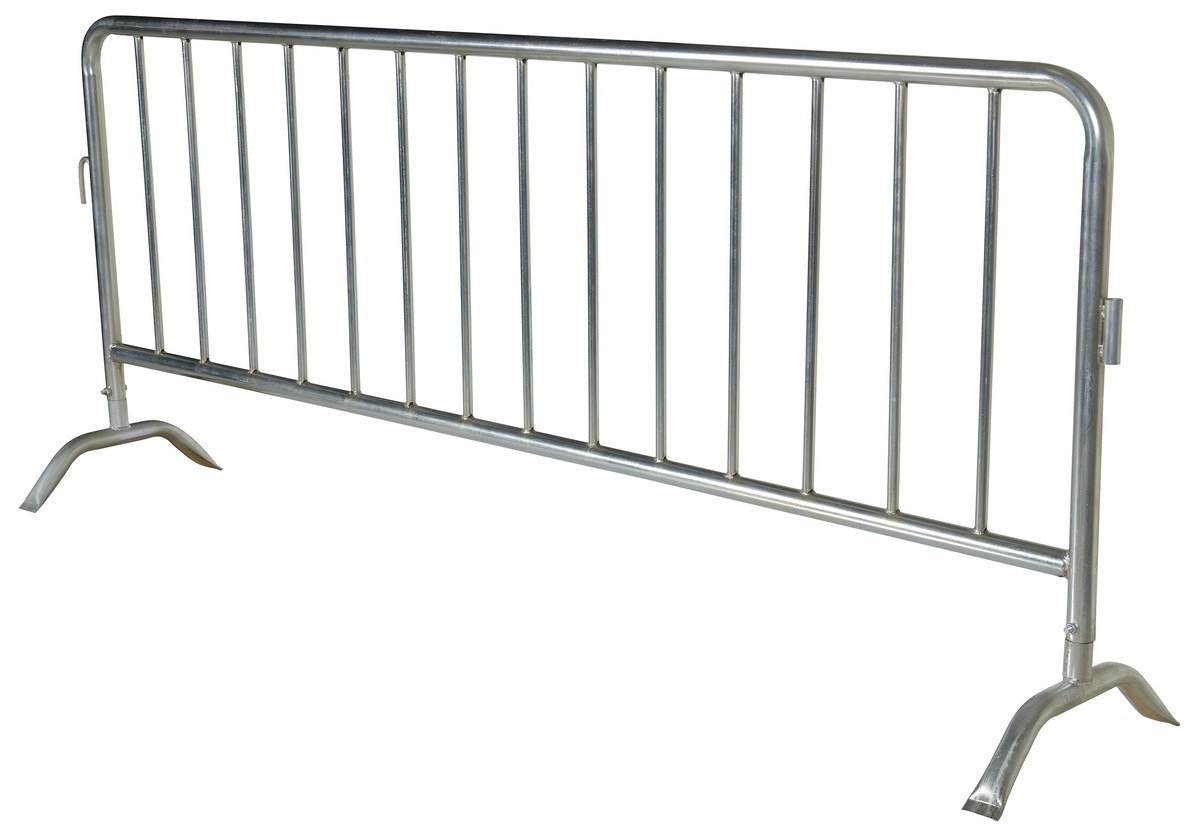 Steel Heavy Duty Crowd Control Interlocking Barrier with Curved Feet 101-3/4 In. Length SilverThe Heavy Duty crowd control interlocking barrier is attractive and the functional design is ideal for directing personnel. Interlocking portable railing has many commercial and industrial applications. Easy to move to meet changing needs. Upright bars are vertically spaced. Each railing includes connectors to attach multiple units together to form long runs. Feet are removable so railing will lay flat for shipping and storage.