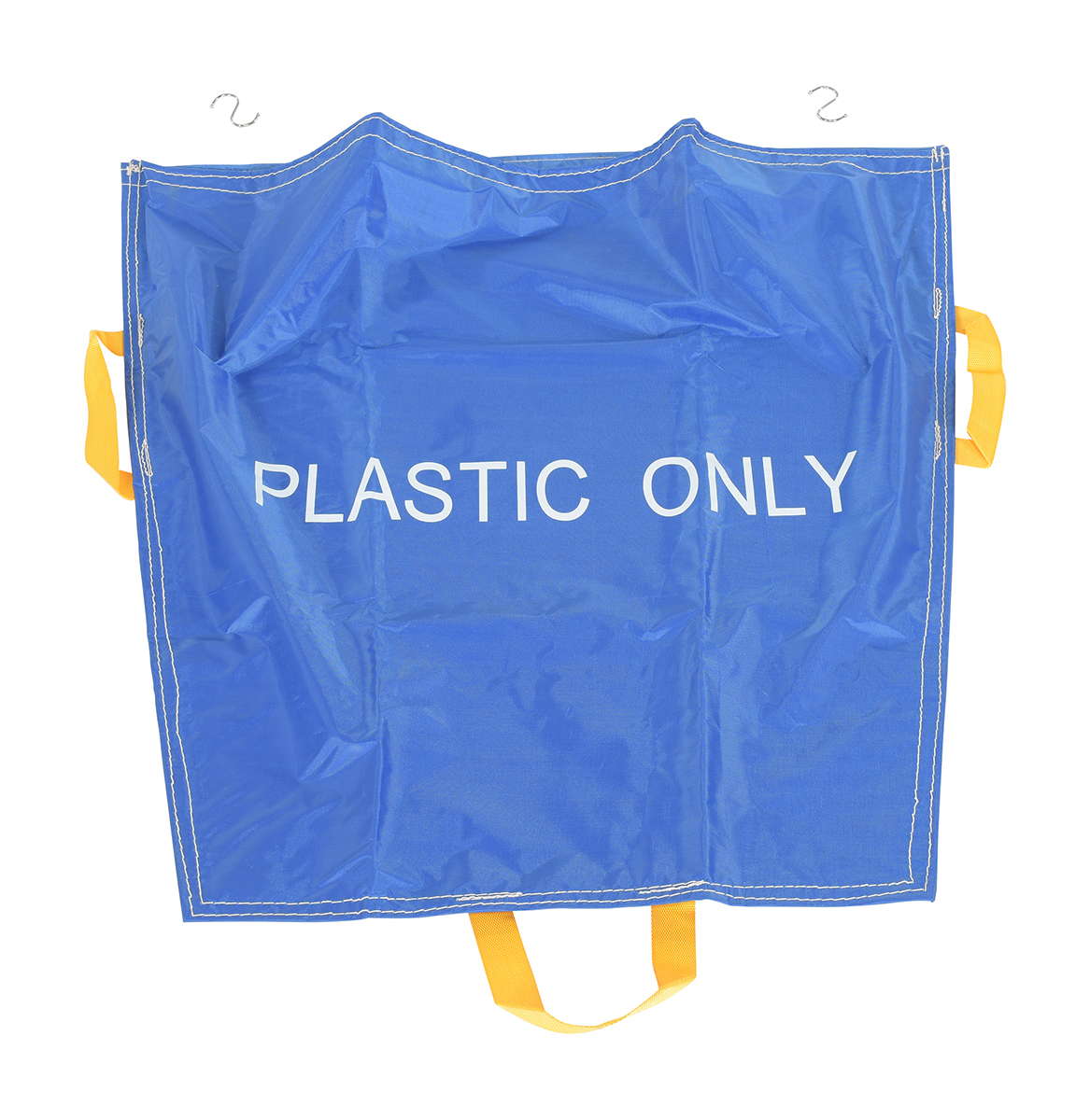 Manufactured from rugged blue waterproof polyester material the pallet rack trash bag has three (3) handles to help with emptying. "S" hooks are included for hanging on pallet rack end frames.